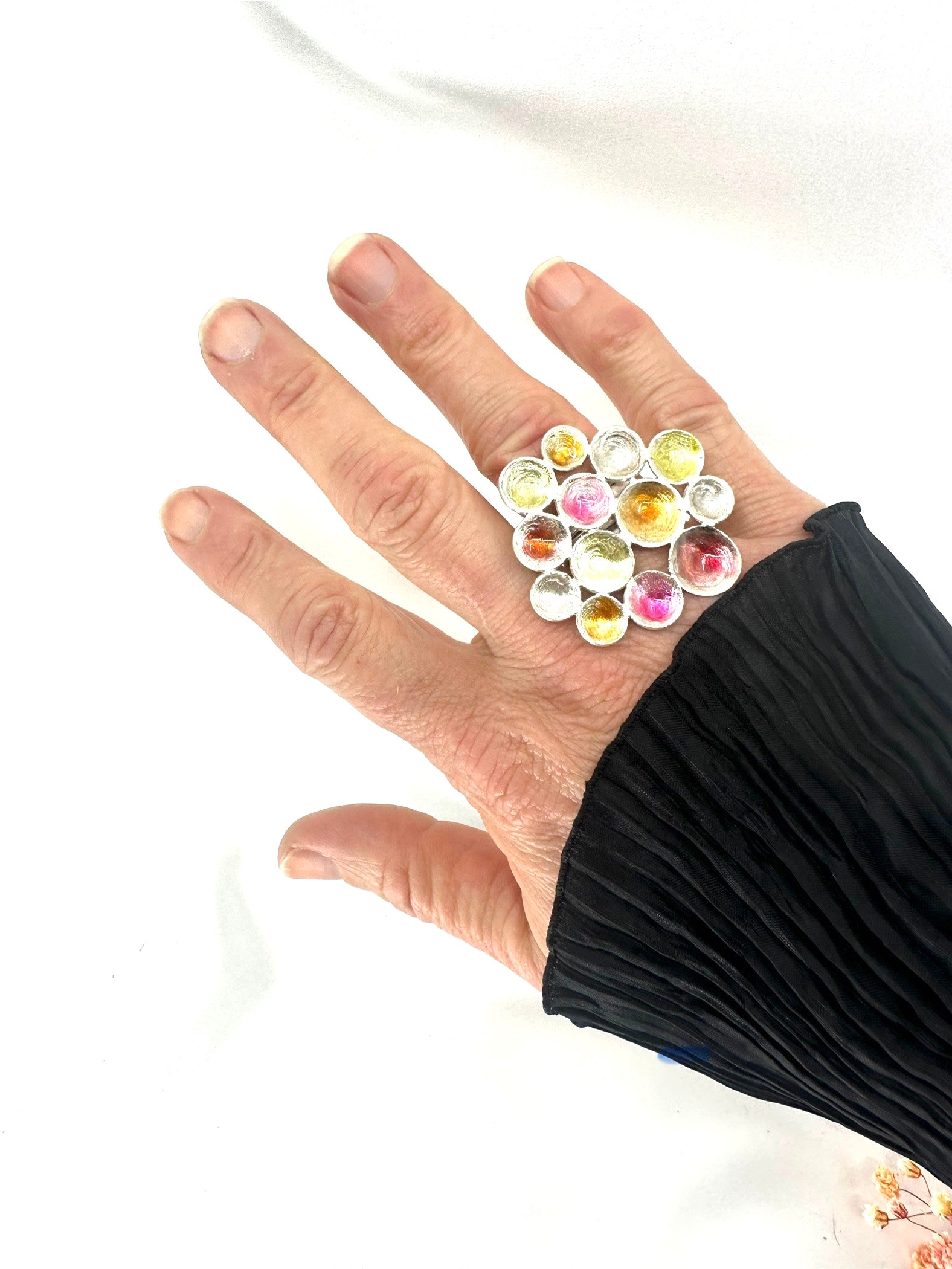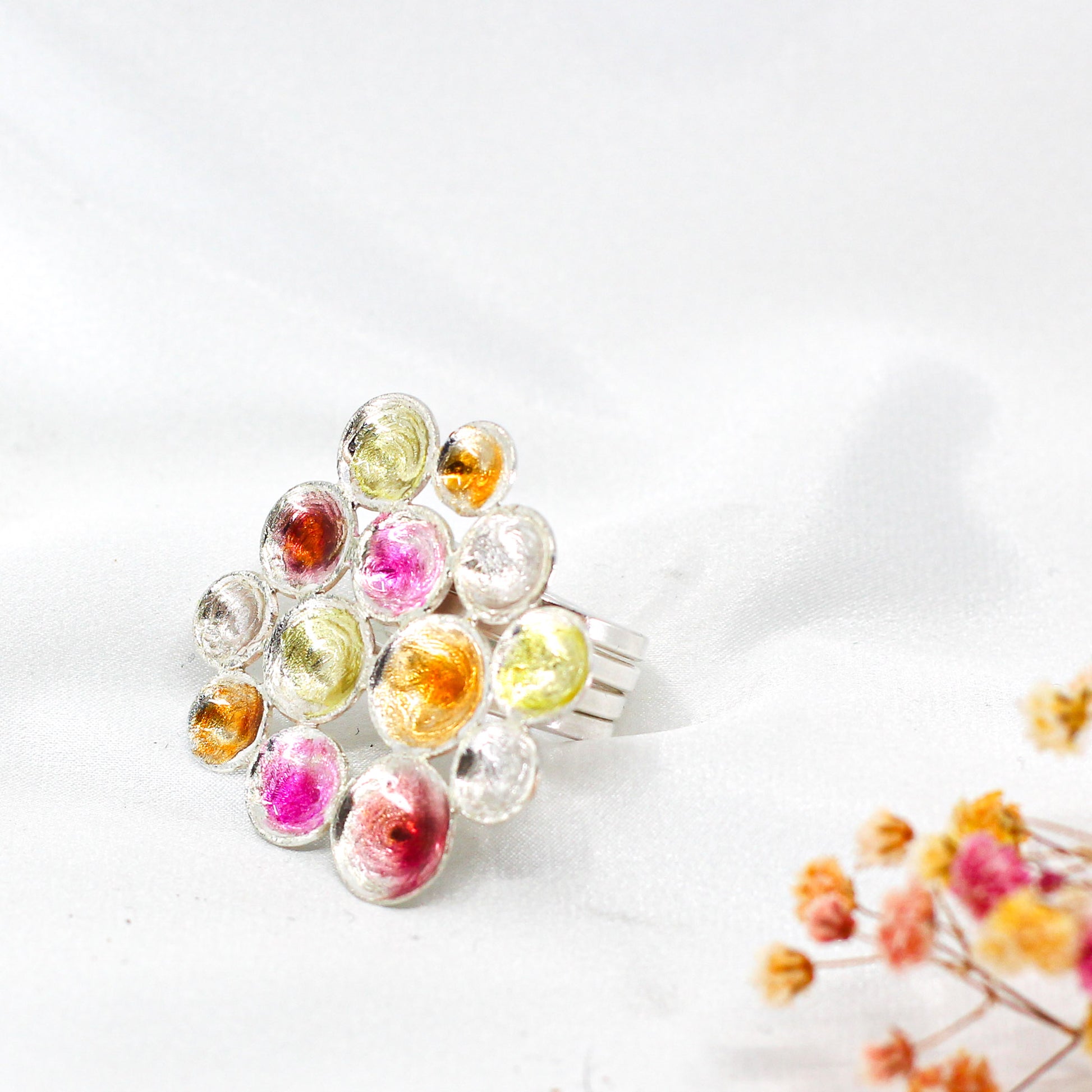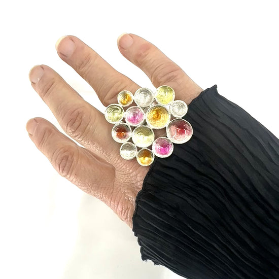 Big Flower Ring in Sterling Silver, coated with red, yellow, orange resin