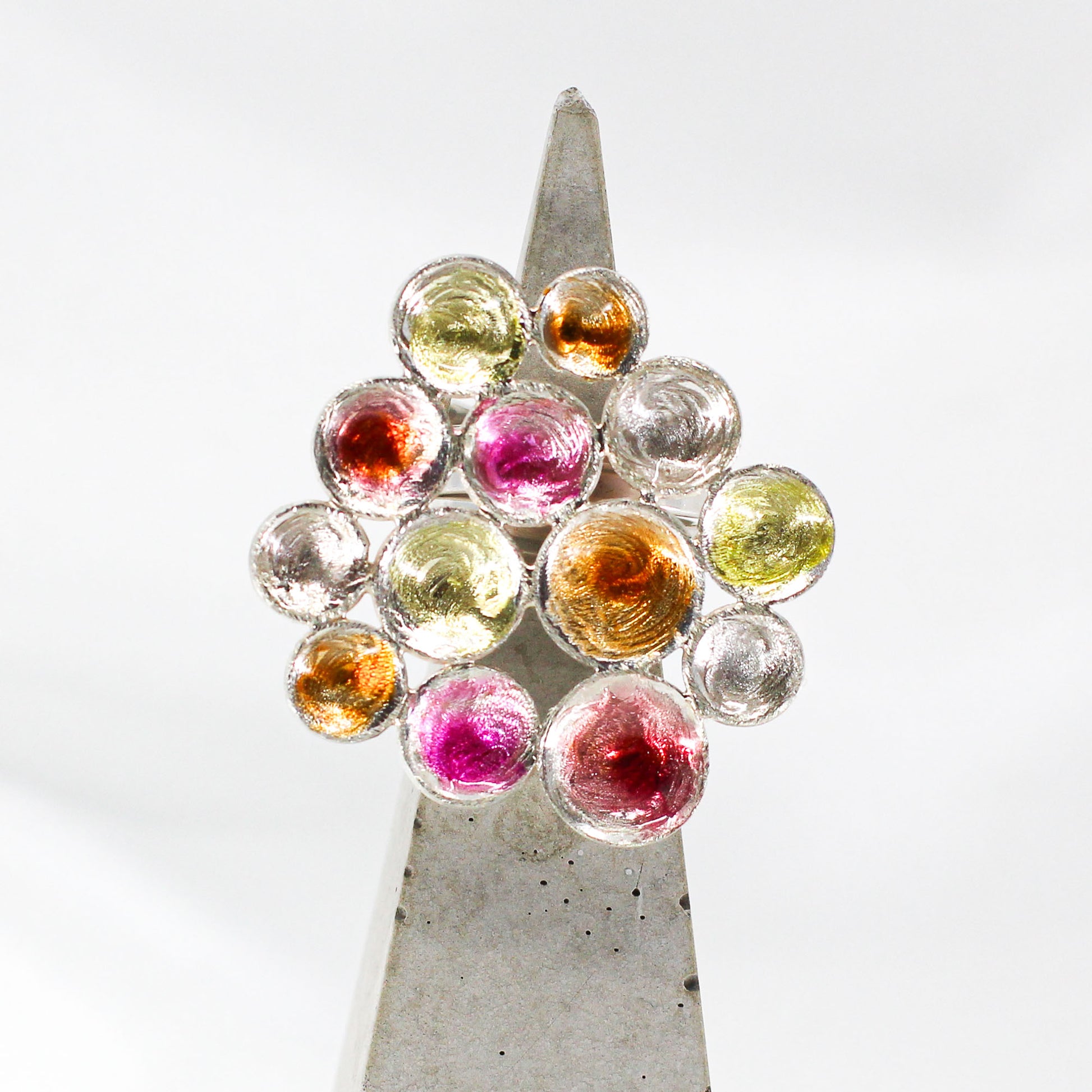 • sterling silver top, coated with beautiful resin tones in red, yellow, orange and pink