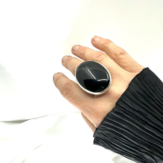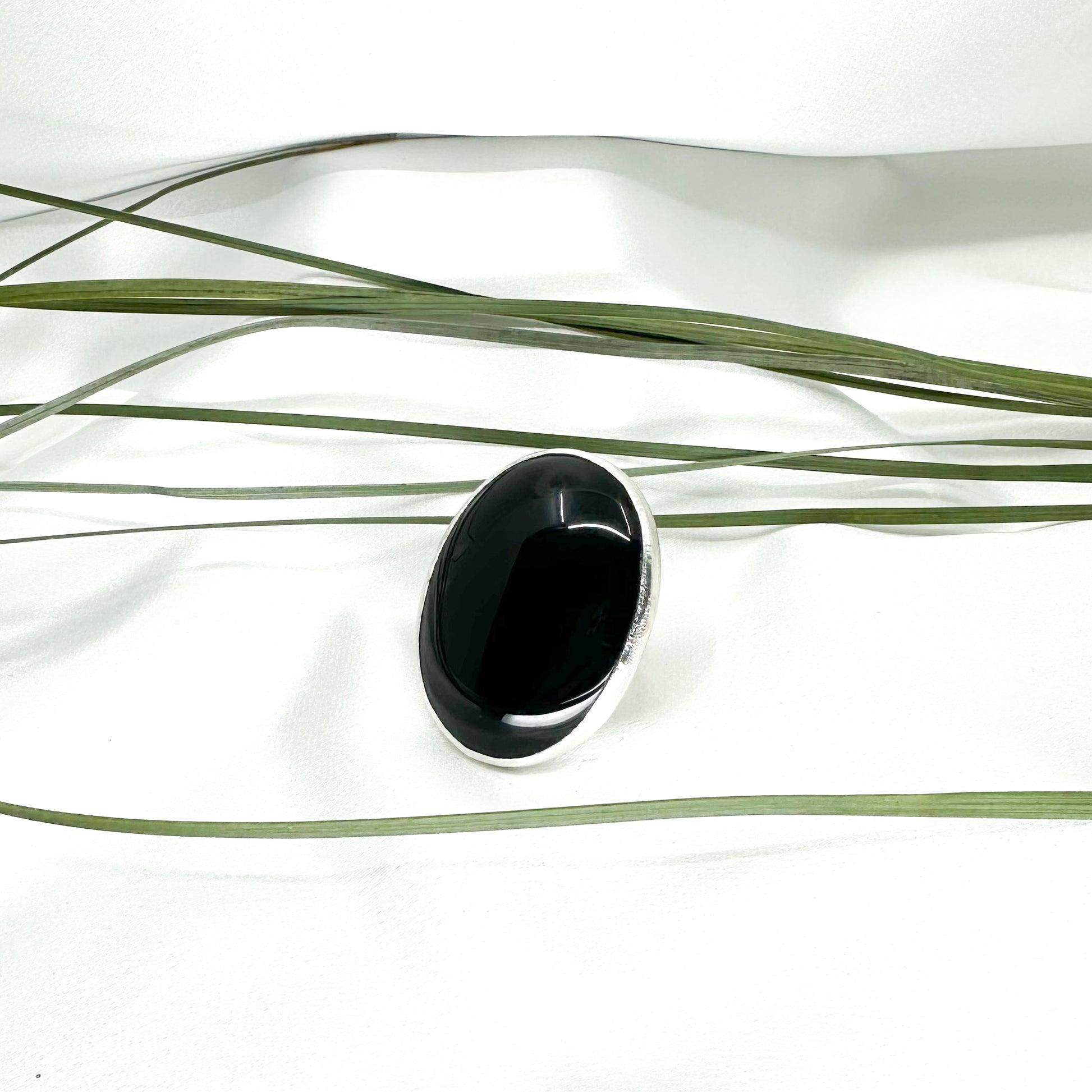 This stunning piece pairs a striking black oval onyx with sterling silver for a bold, eye-catching look.