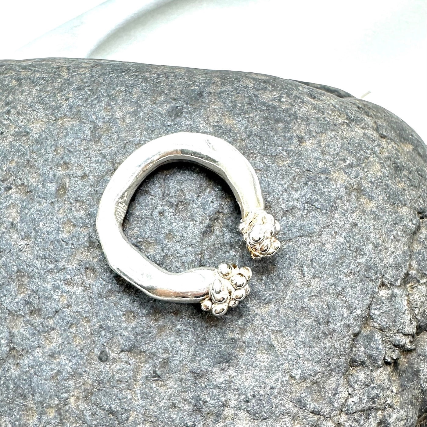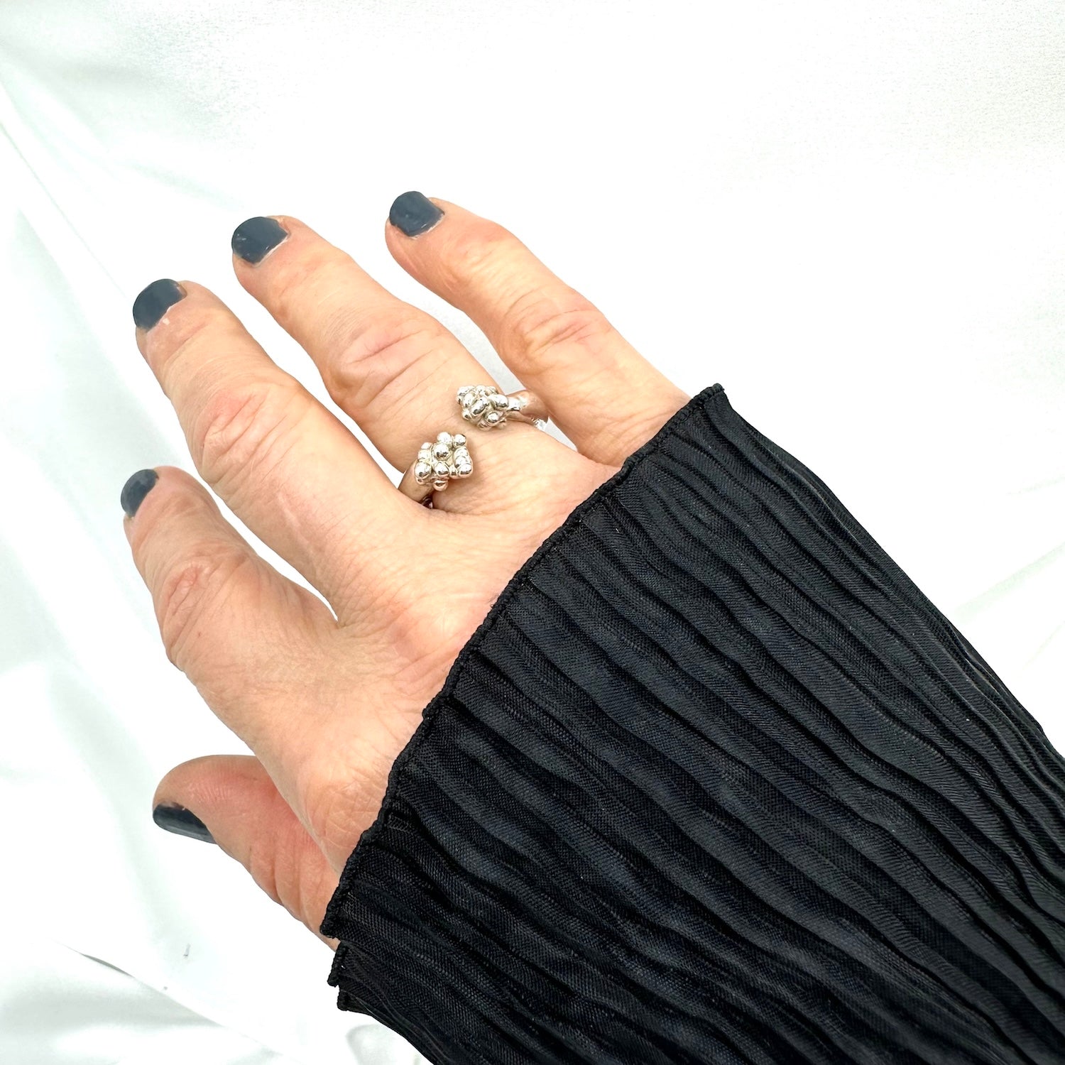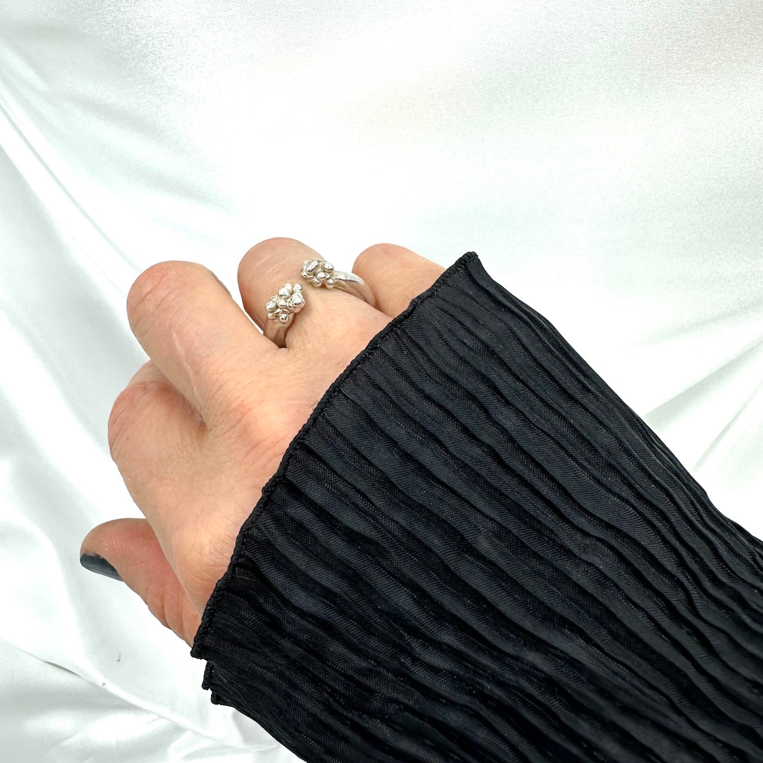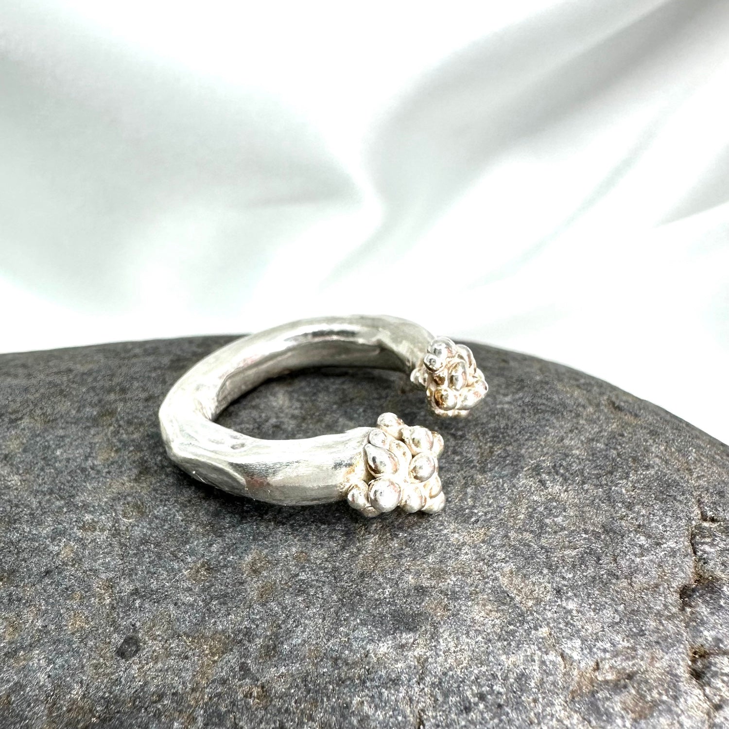 Bold open ring handcrafted in sterling silver, featuring organic molten clusters at each end.