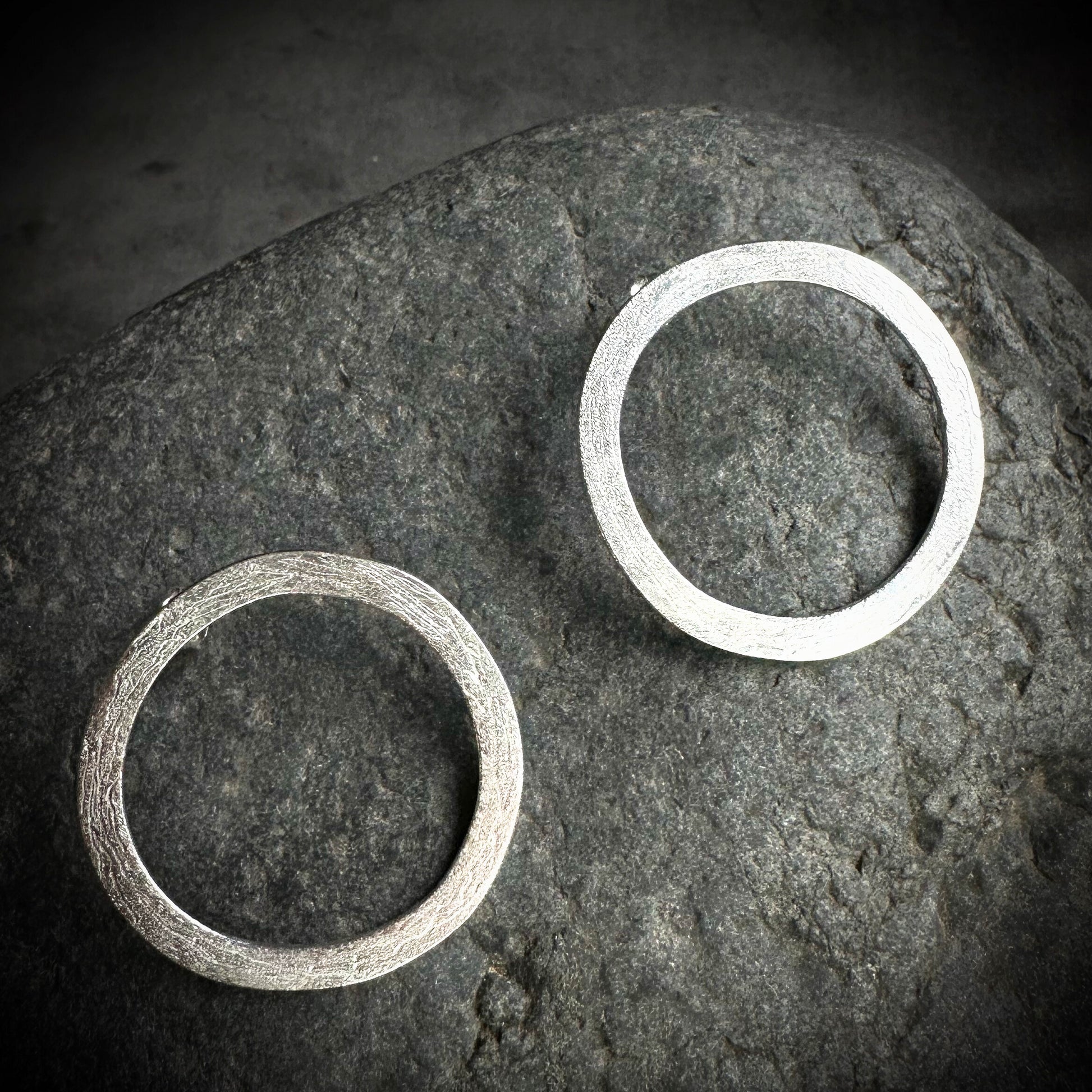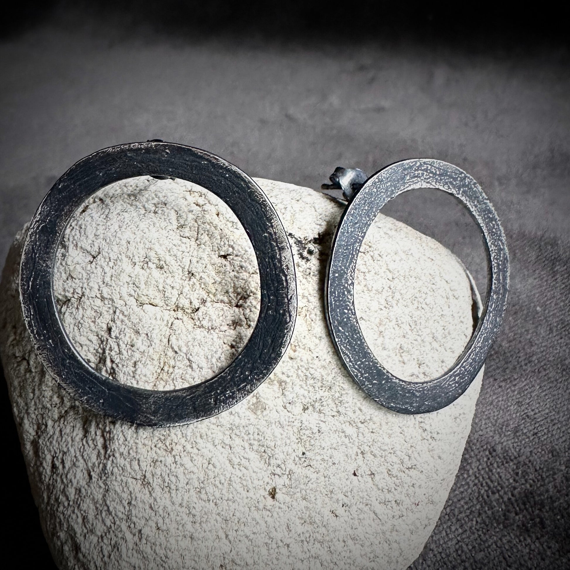 The circle stud earrings are handmade to order, ensuring that each item is unique. The textured finish of the circles reduces the shine, giving a more matte look that allows the shape to be the main focus of the design. Not exactly round, not exactly oval, the organic shape captures complexities that are enhanced by the textured finish.
