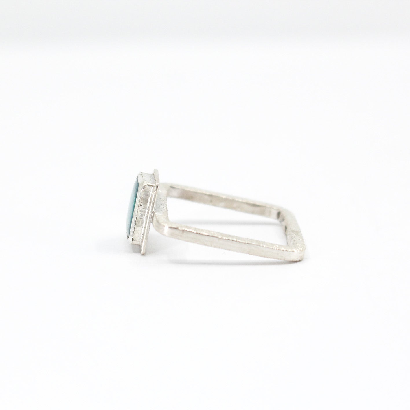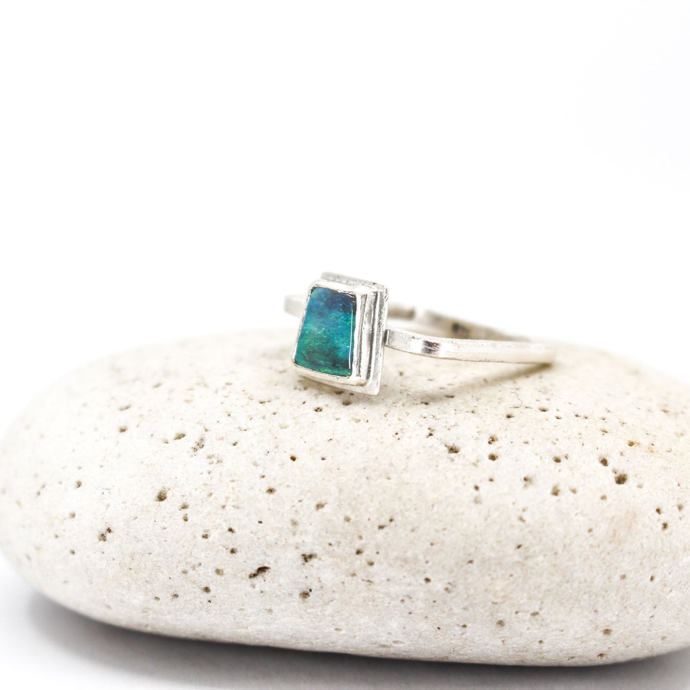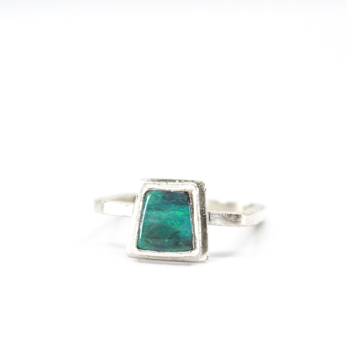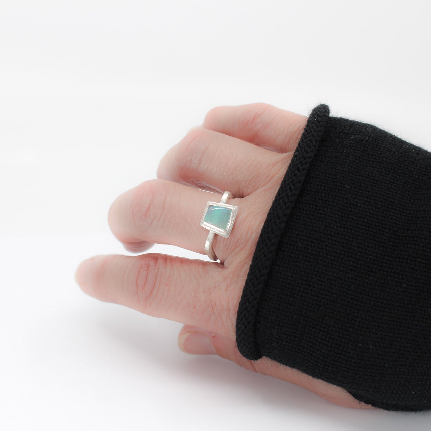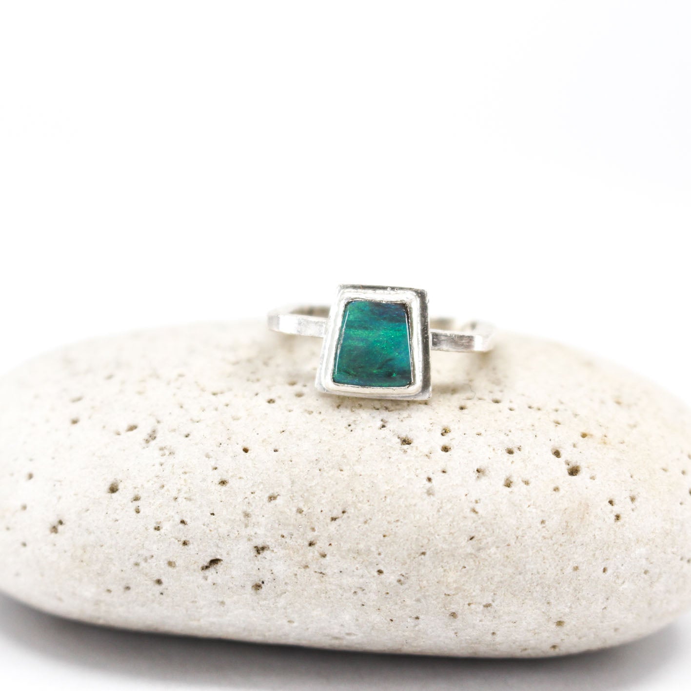 green minimalist Australian opal ring with hammered square 925 eco sterling silver band