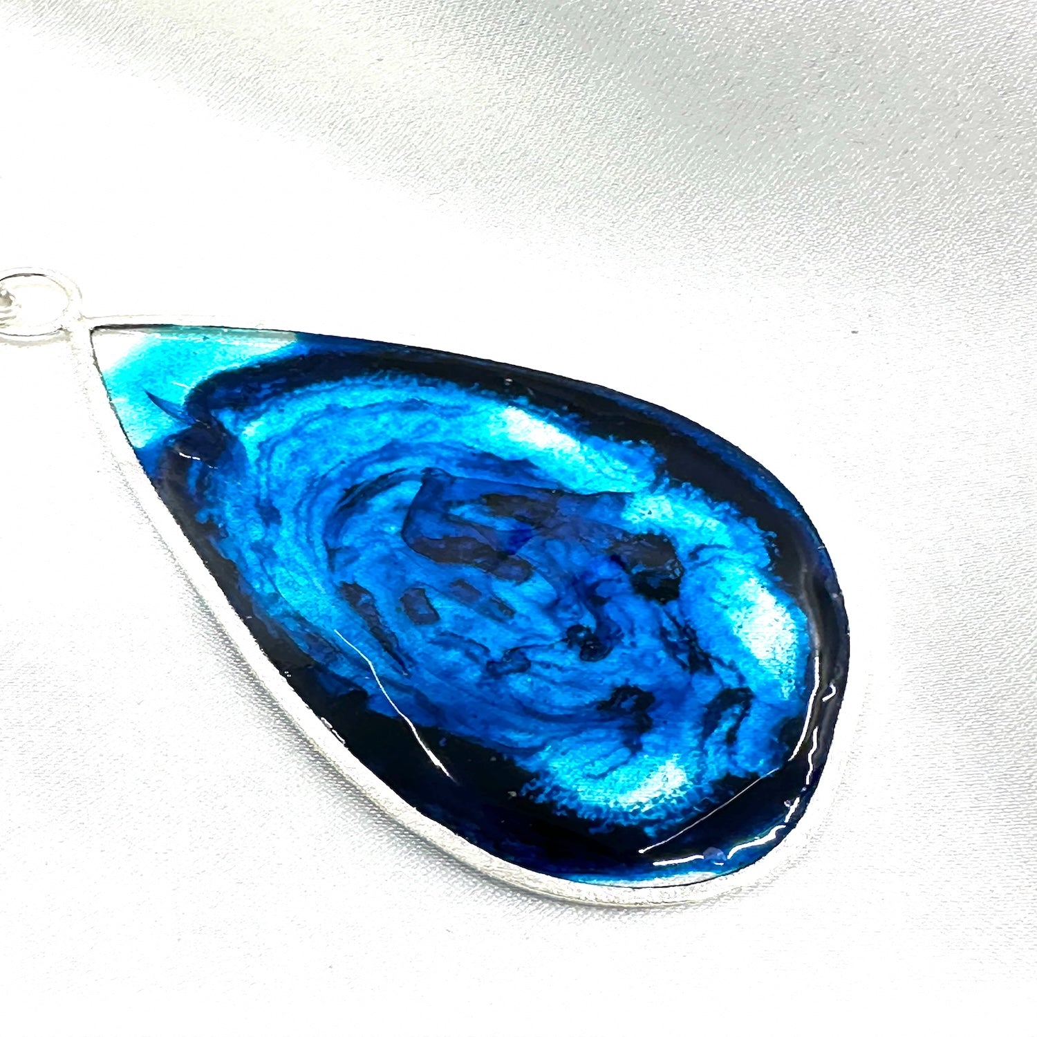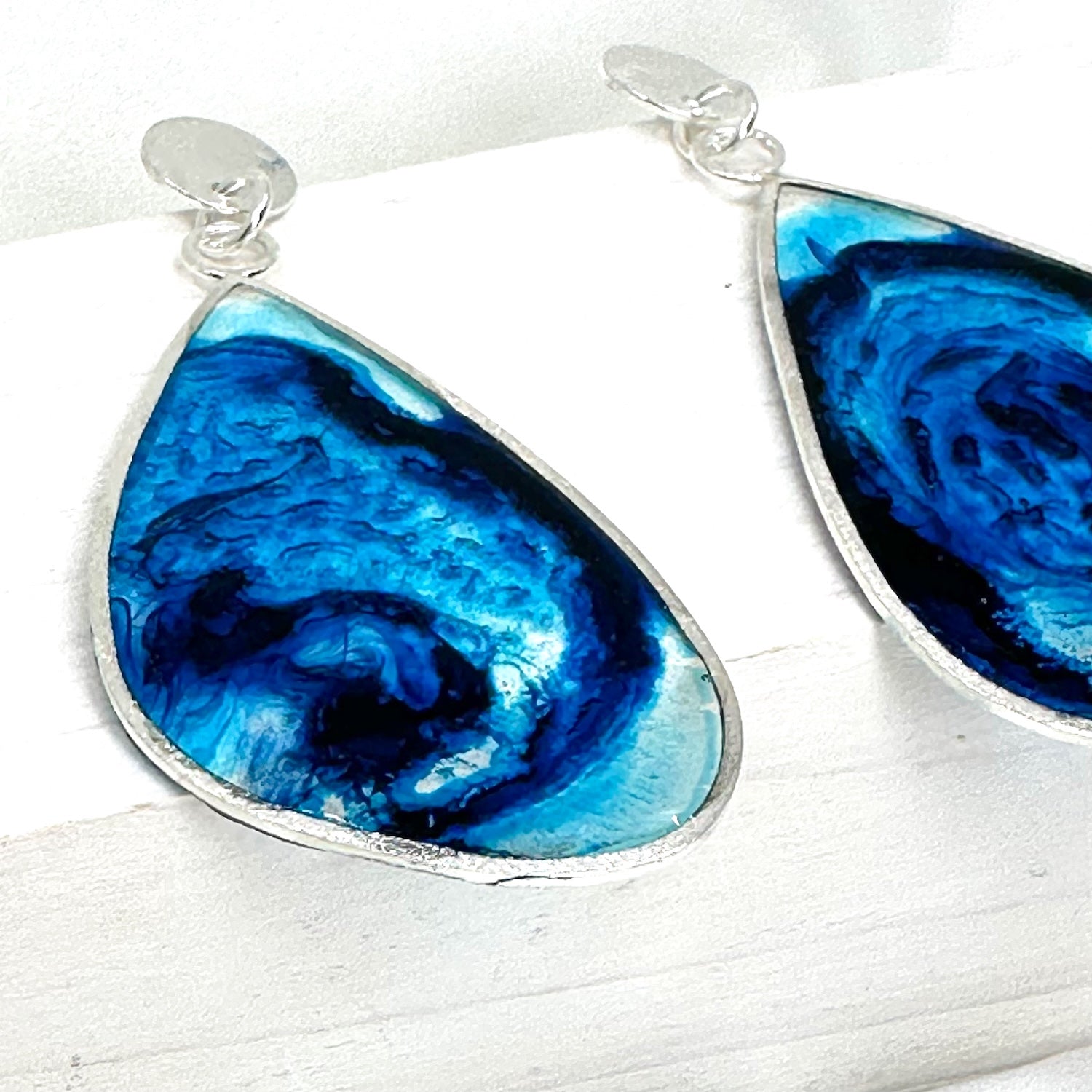 Hand-dyed resin evokes tidal patterns in deep blue, framed in sterling silver.