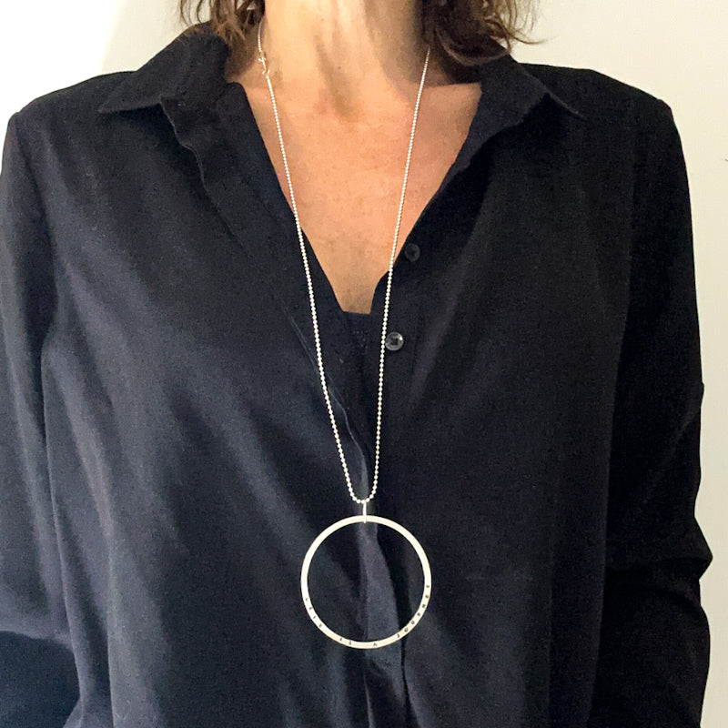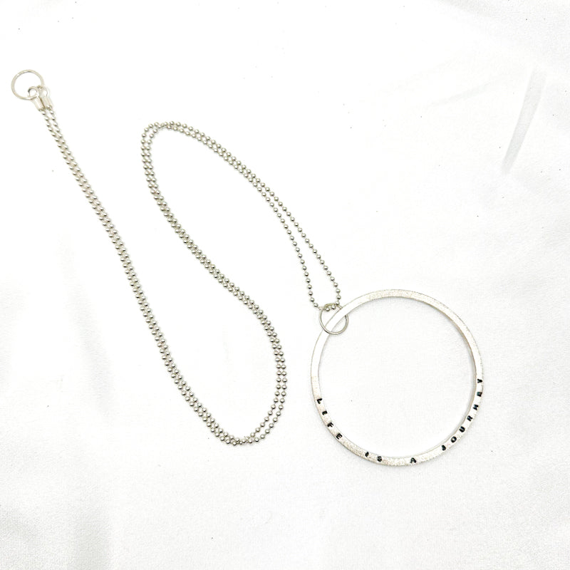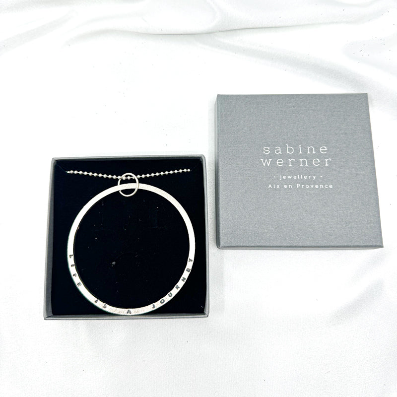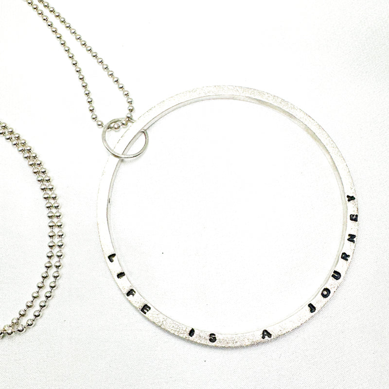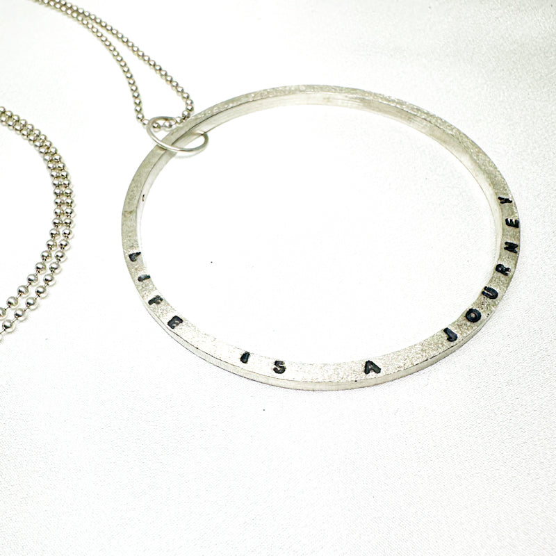 This one-of-a-kind piece features a textured sterling silver ring hand-stamped with the quote "Life is a journey" paired with a sleek Sterling silver ball chain.