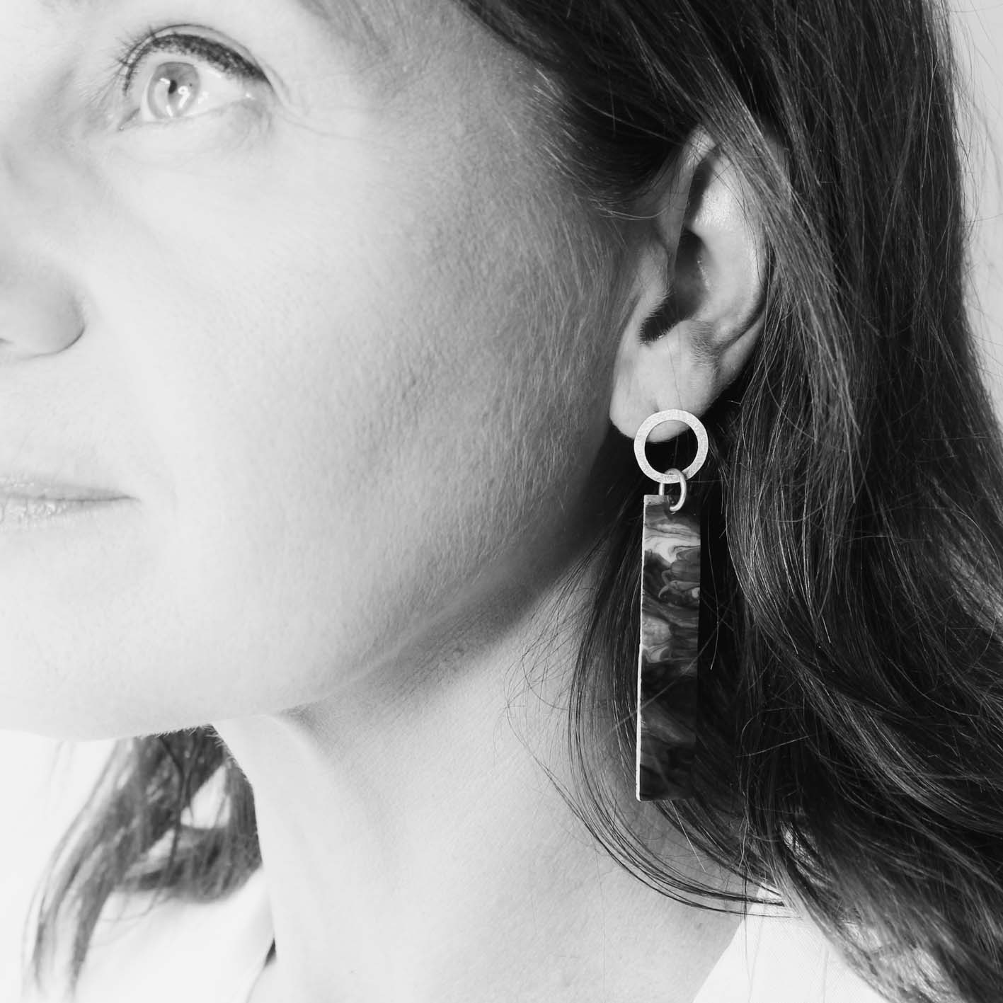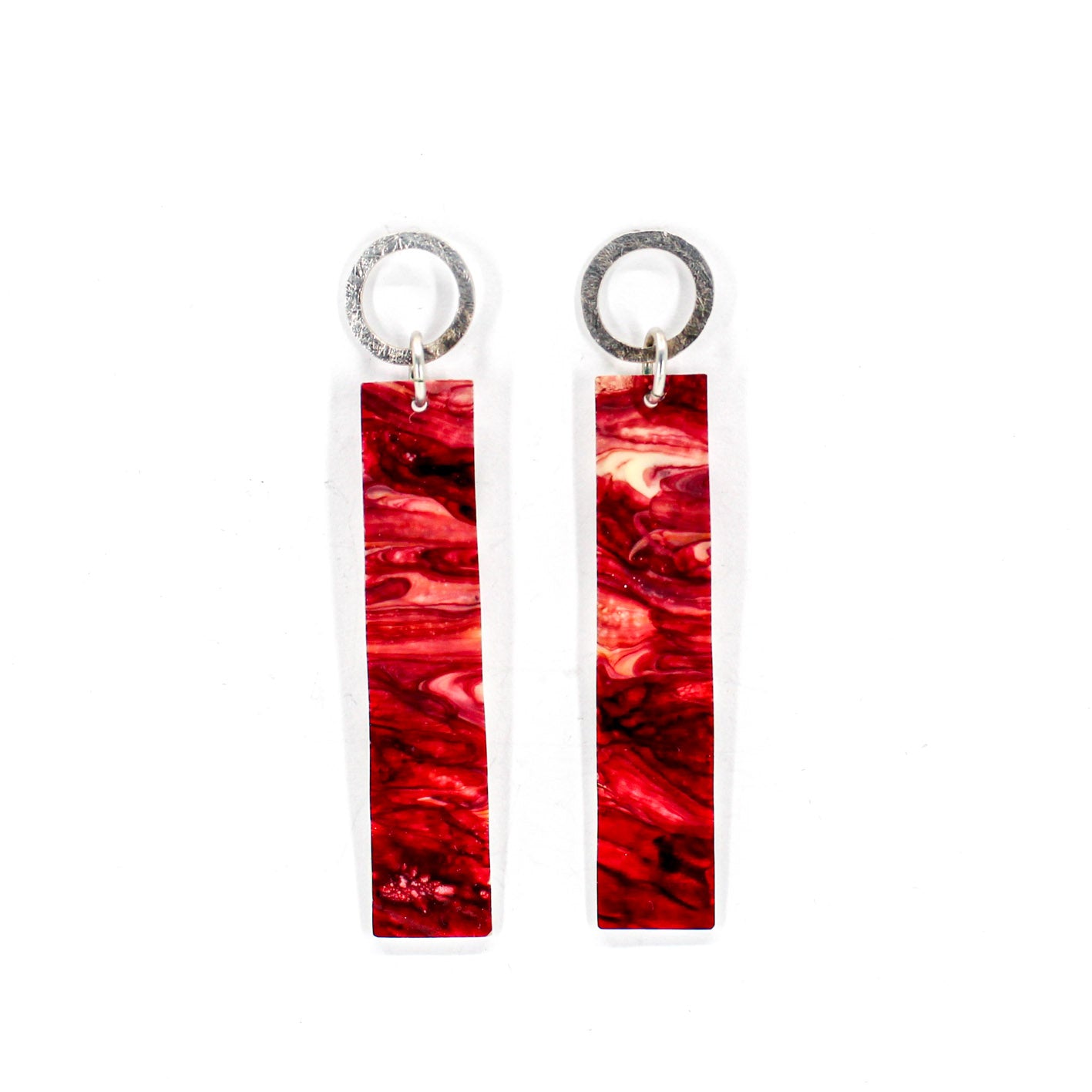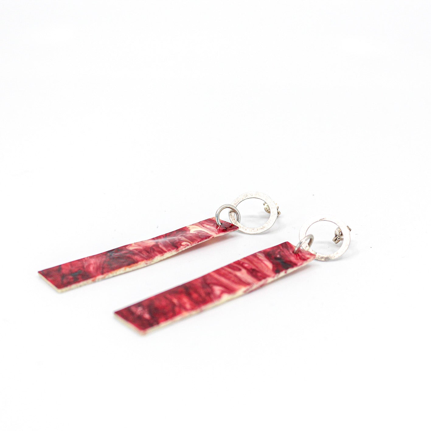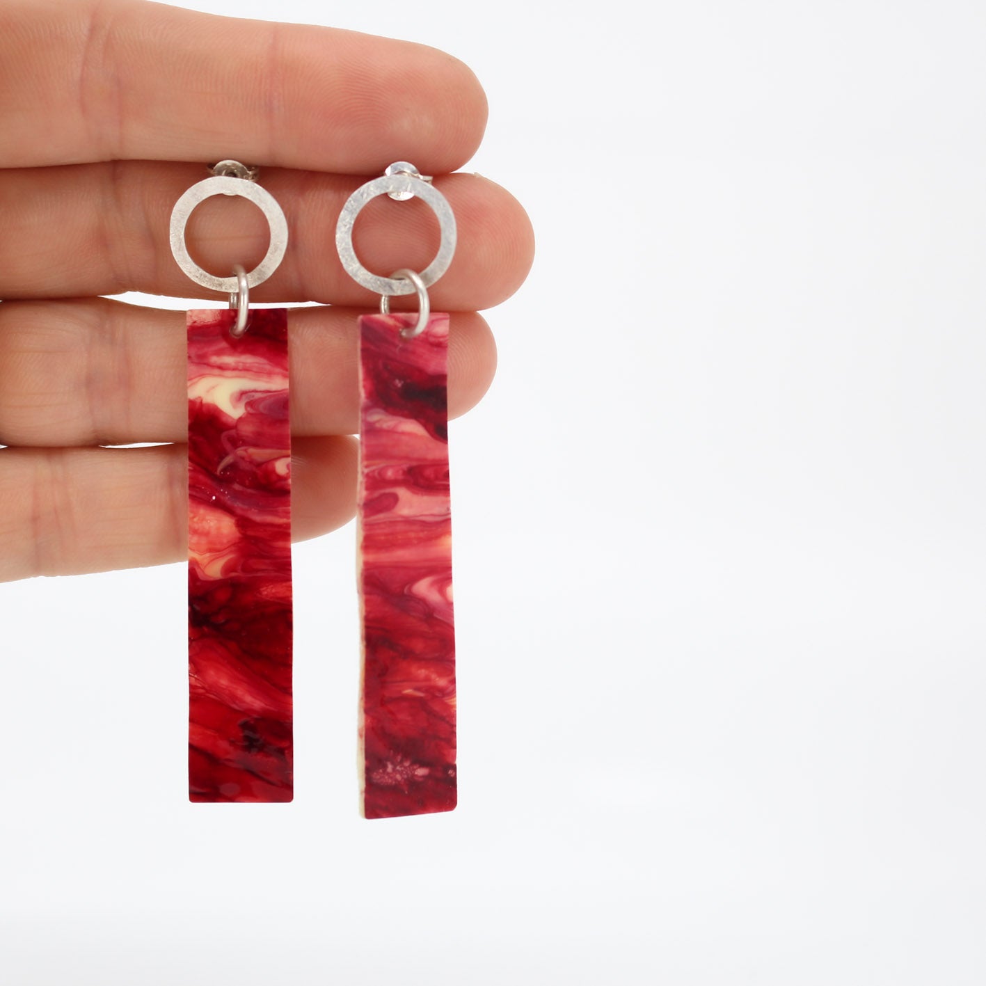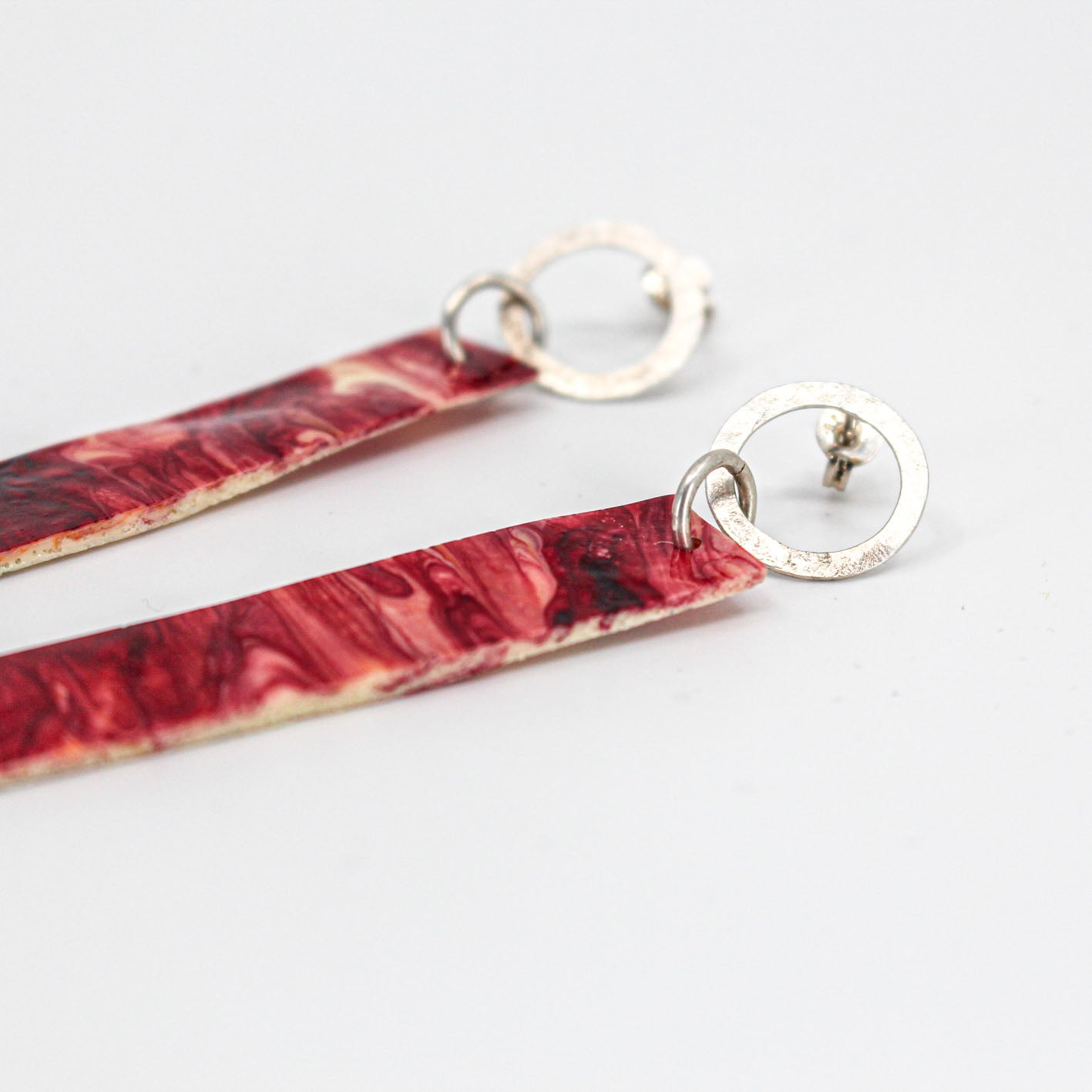 long dangling earrings • hammered sterling silver circle • red marbled resin element