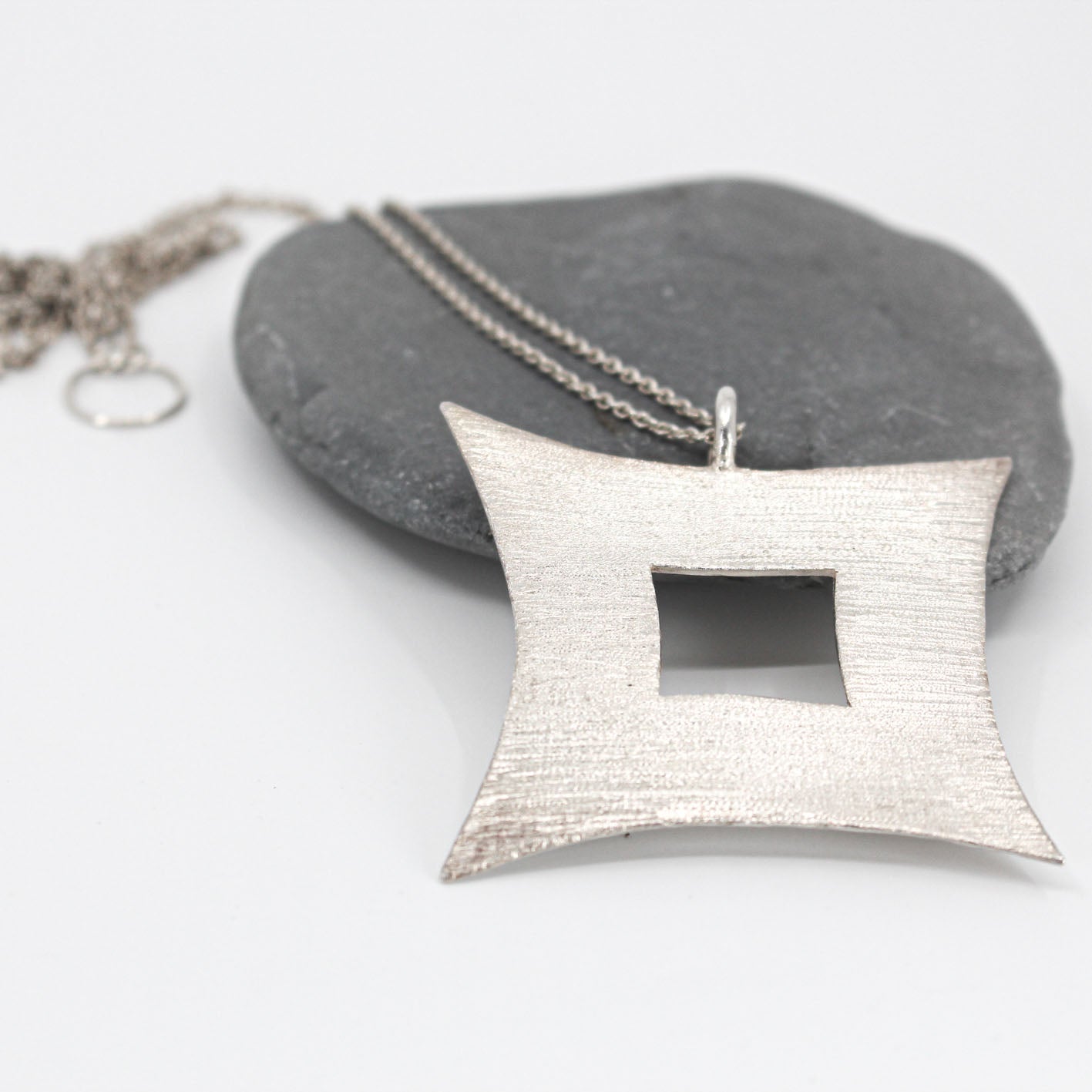 Its captivating design showcases a silver square statement pendant handcrafted with 925 eco sterling silver, making it a stylish and sustainable accessory for any occasion.