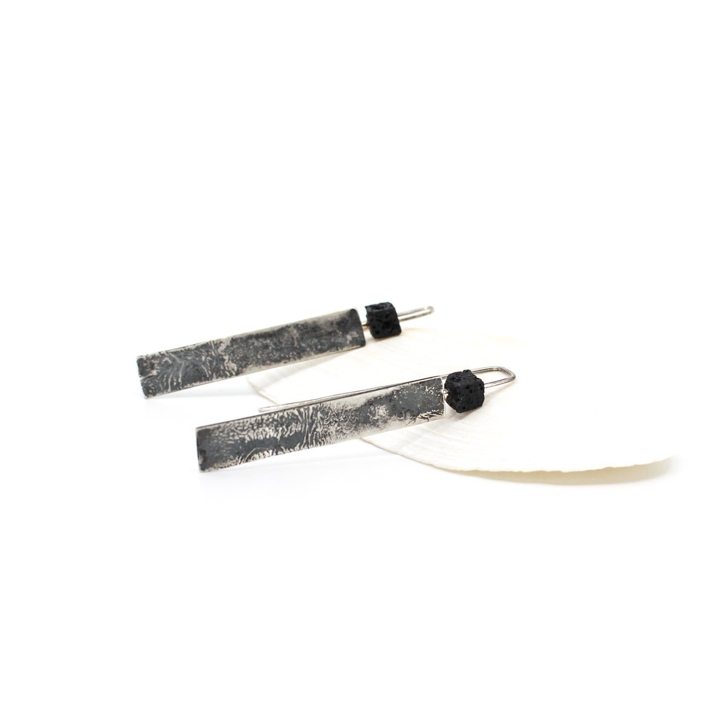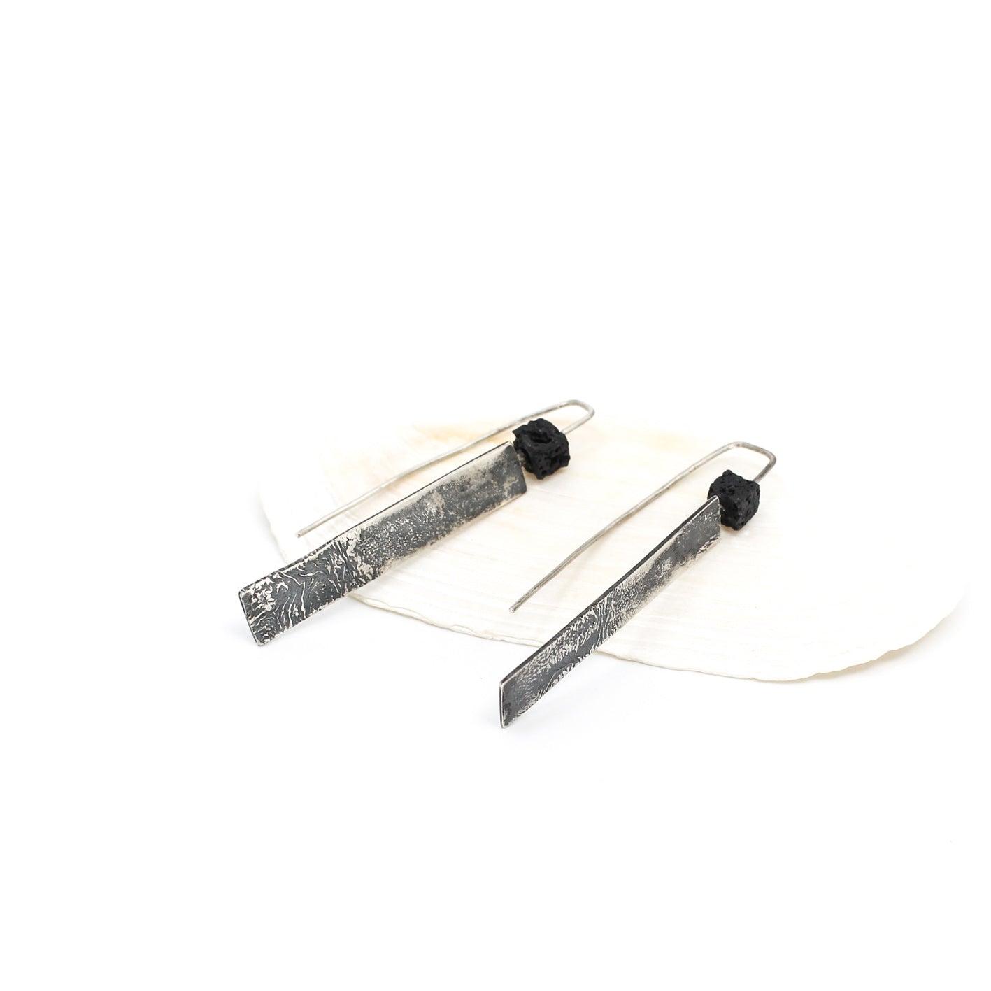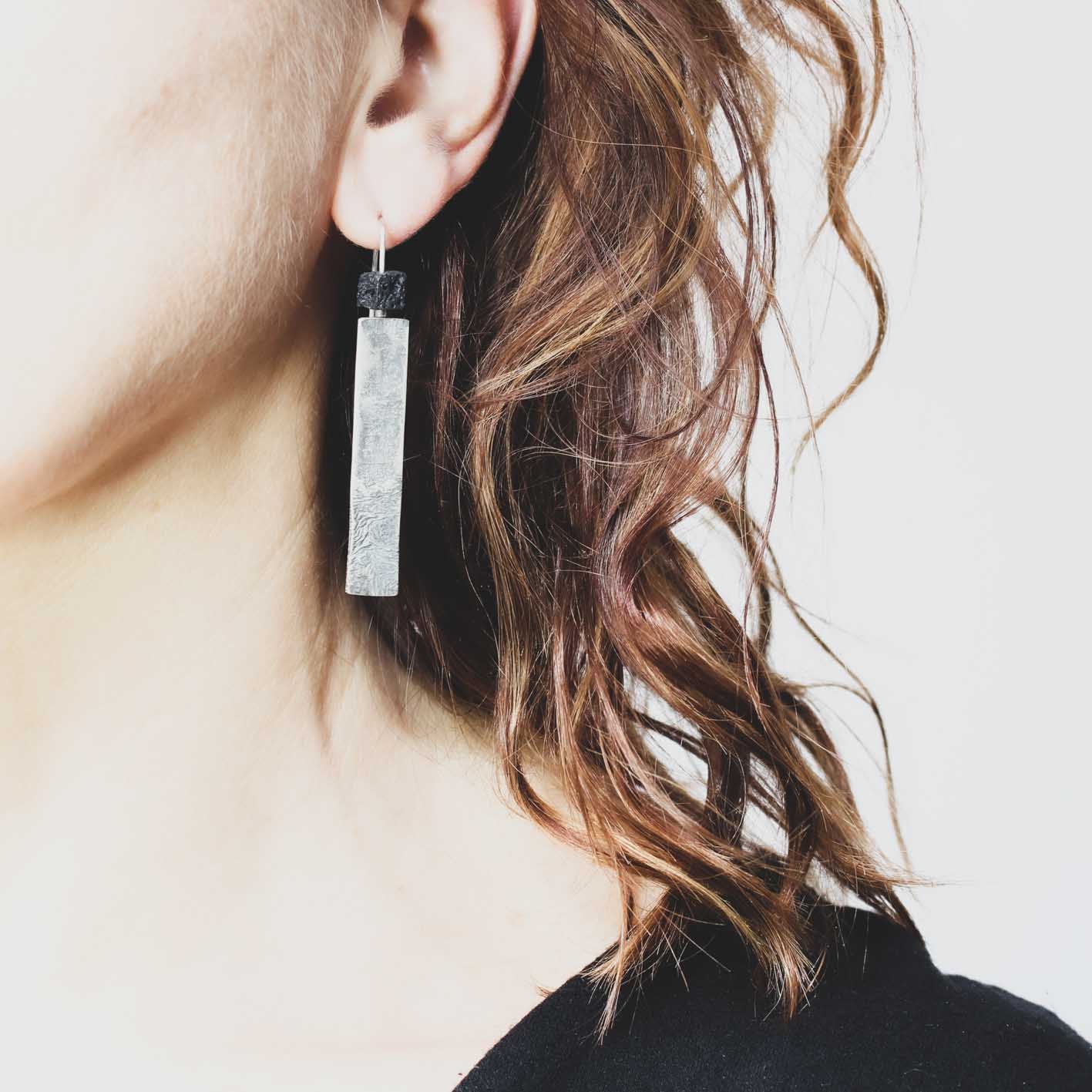 Long minimalist statement earrings in 925 sterling silver with a cubic lava bead.