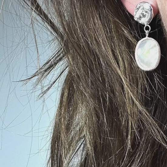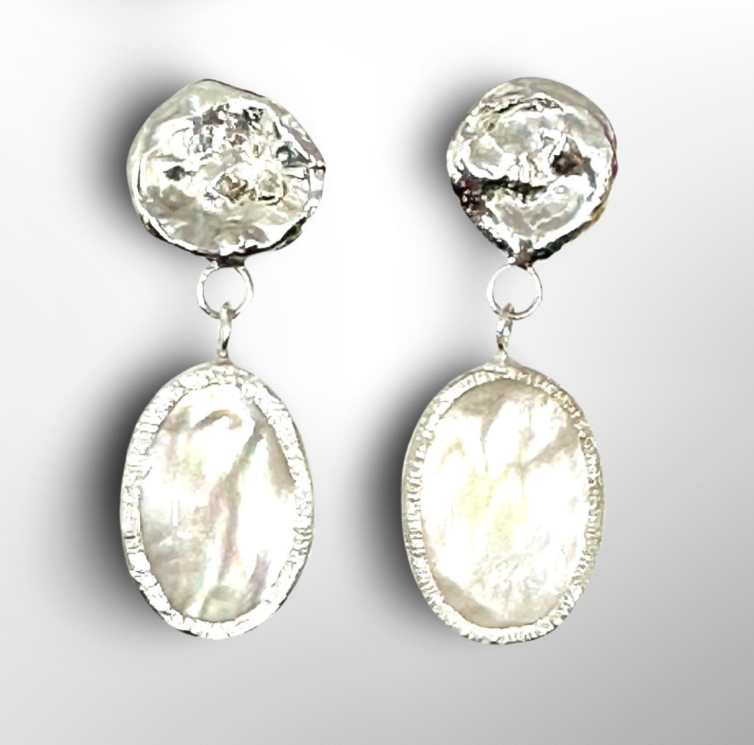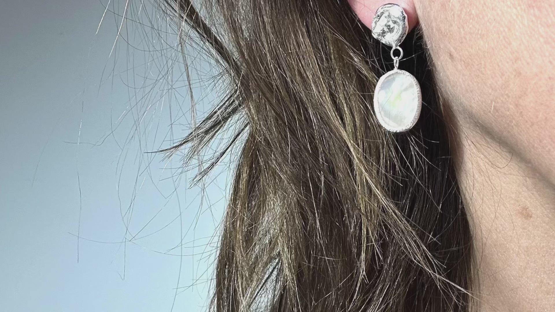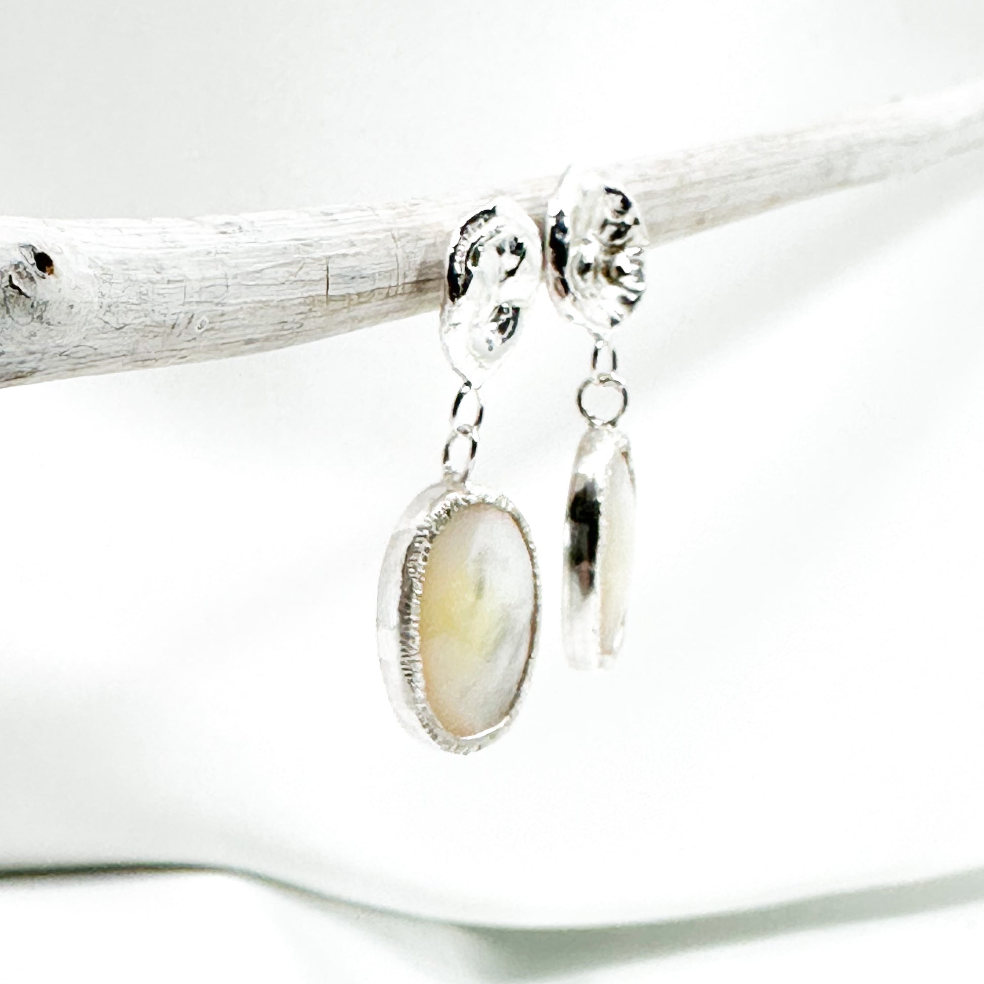 Discover the elegance of those dangling earrings, featuring lustrous Mother of Pearl stones gracefully suspended from sterling silver.