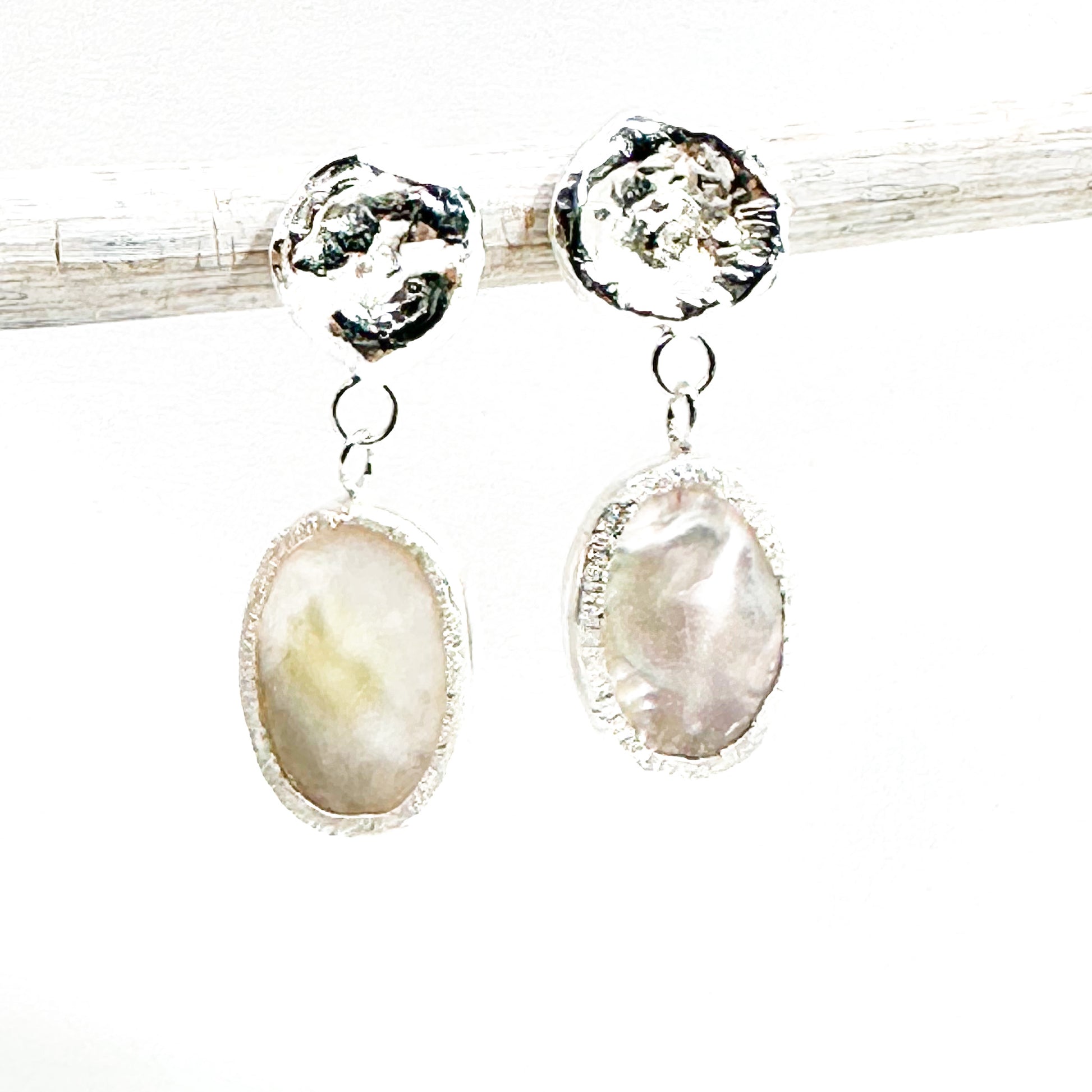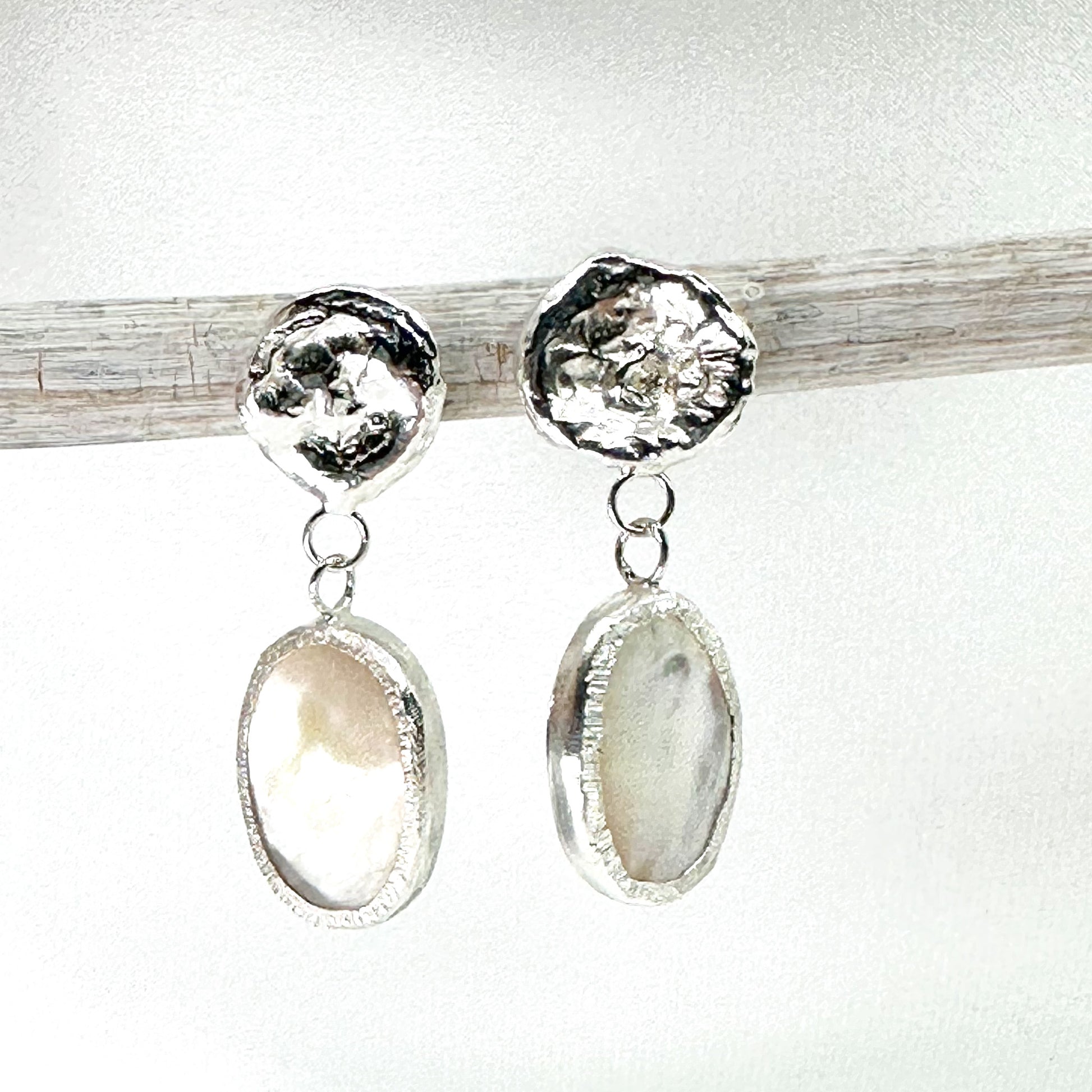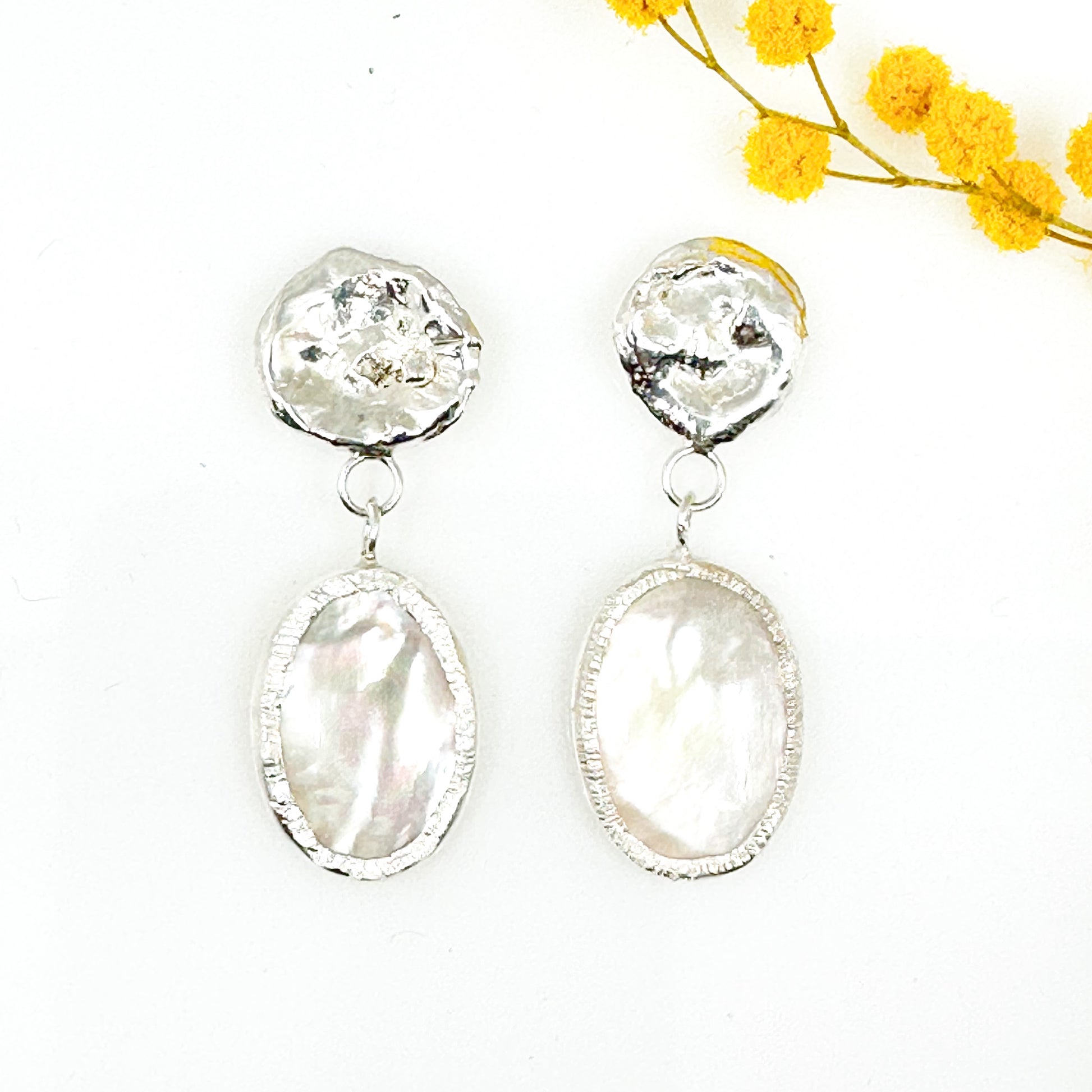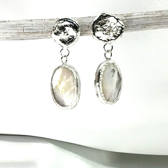 Discover the elegance of those dangling earrings, featuring lustrous Mother of Pearl stones gracefully suspended from sterling silver.