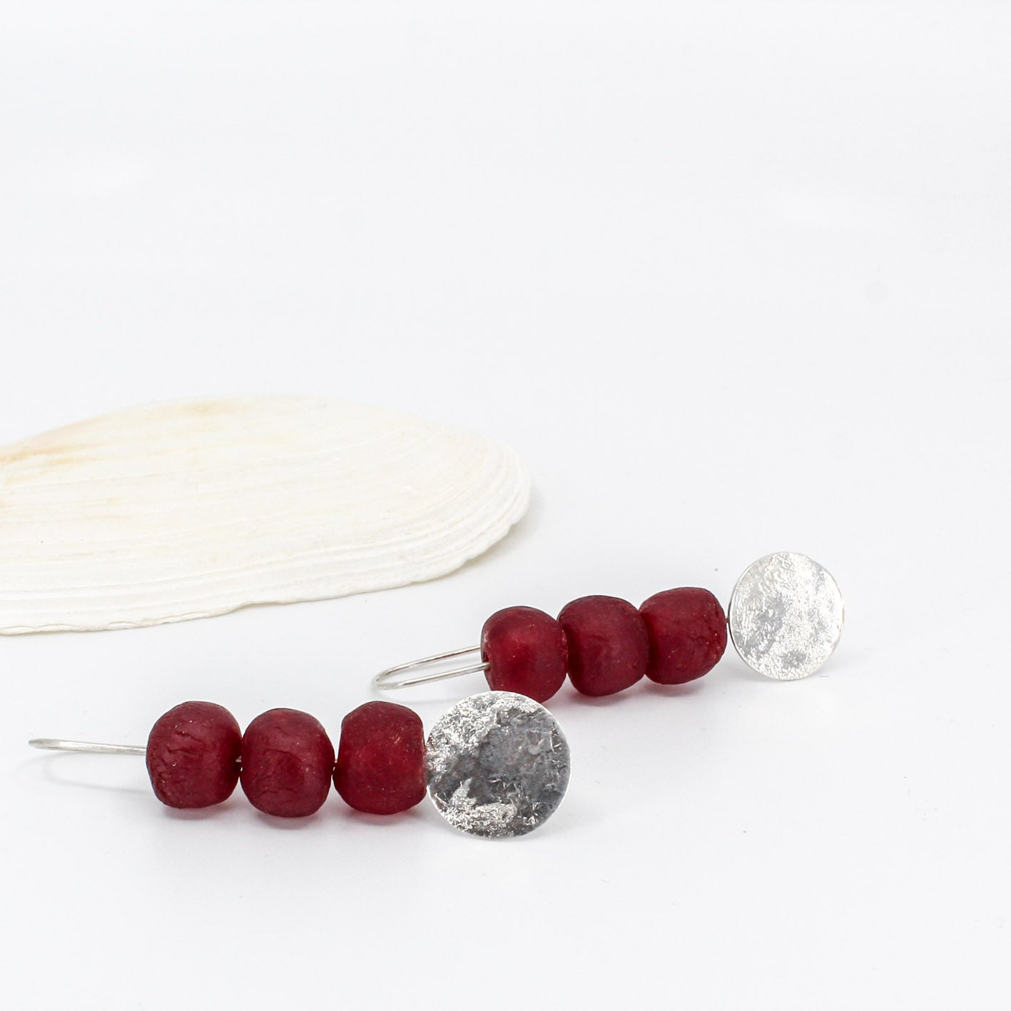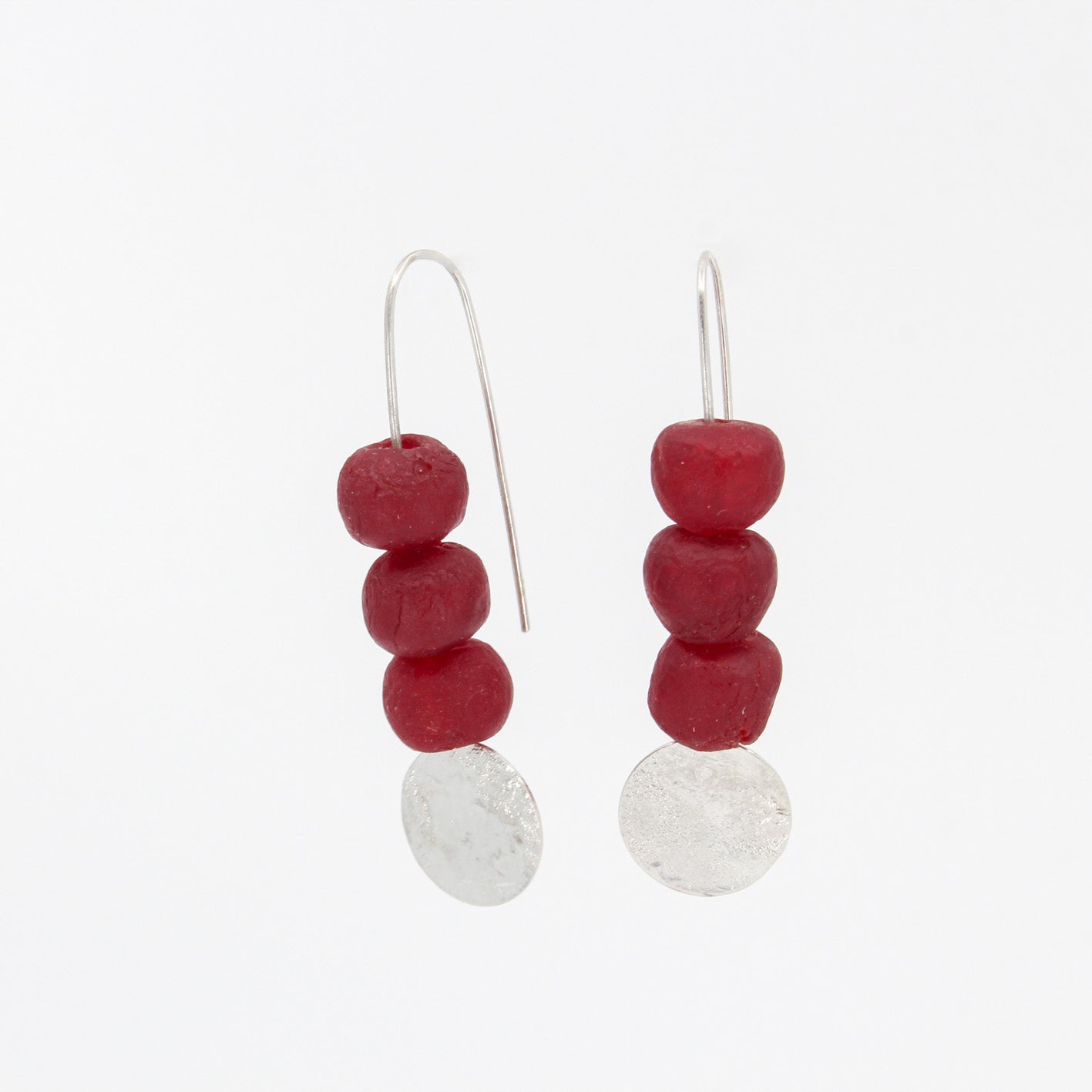 These modern and simple drop earrings are handmade out of red African glass beads on a sterling silver base.