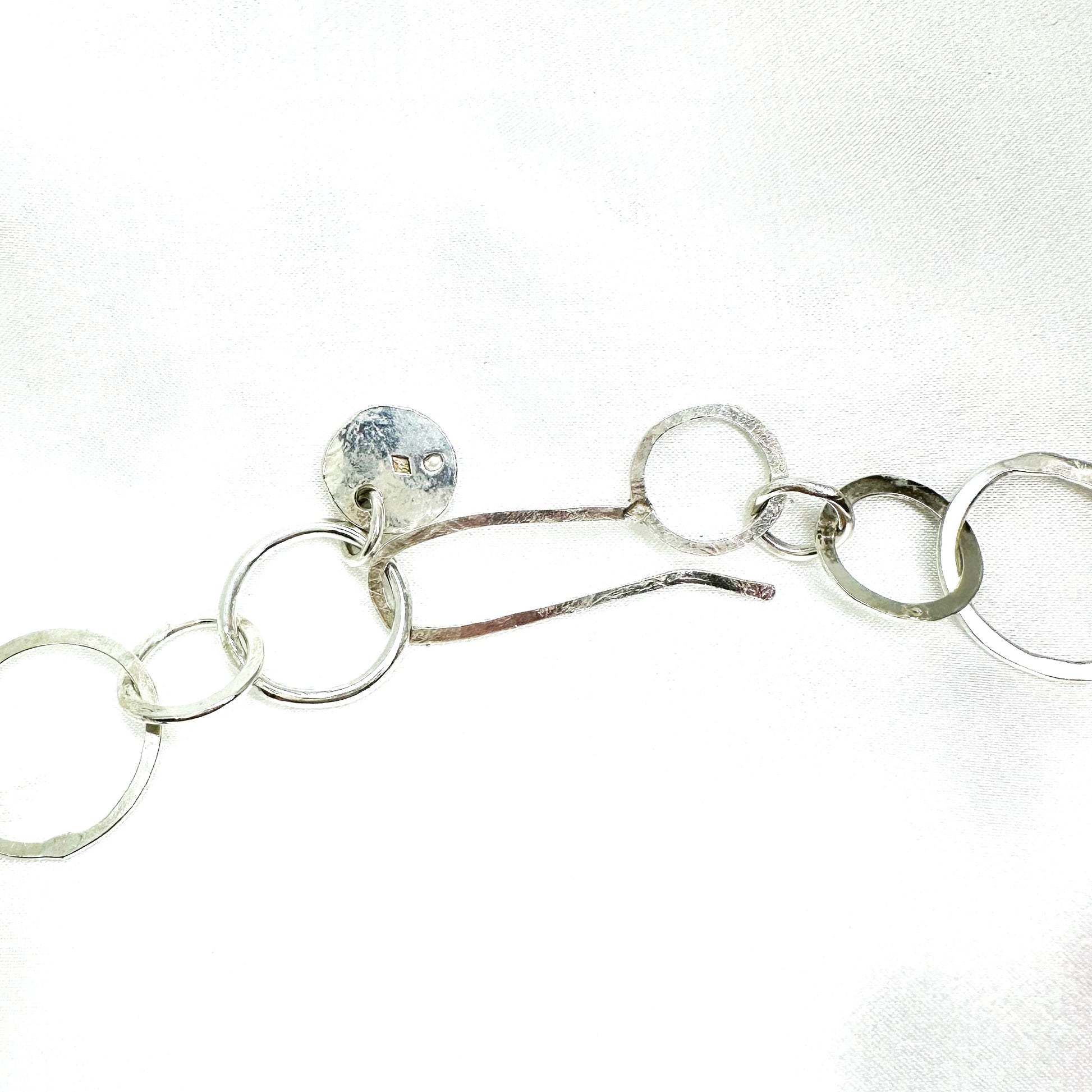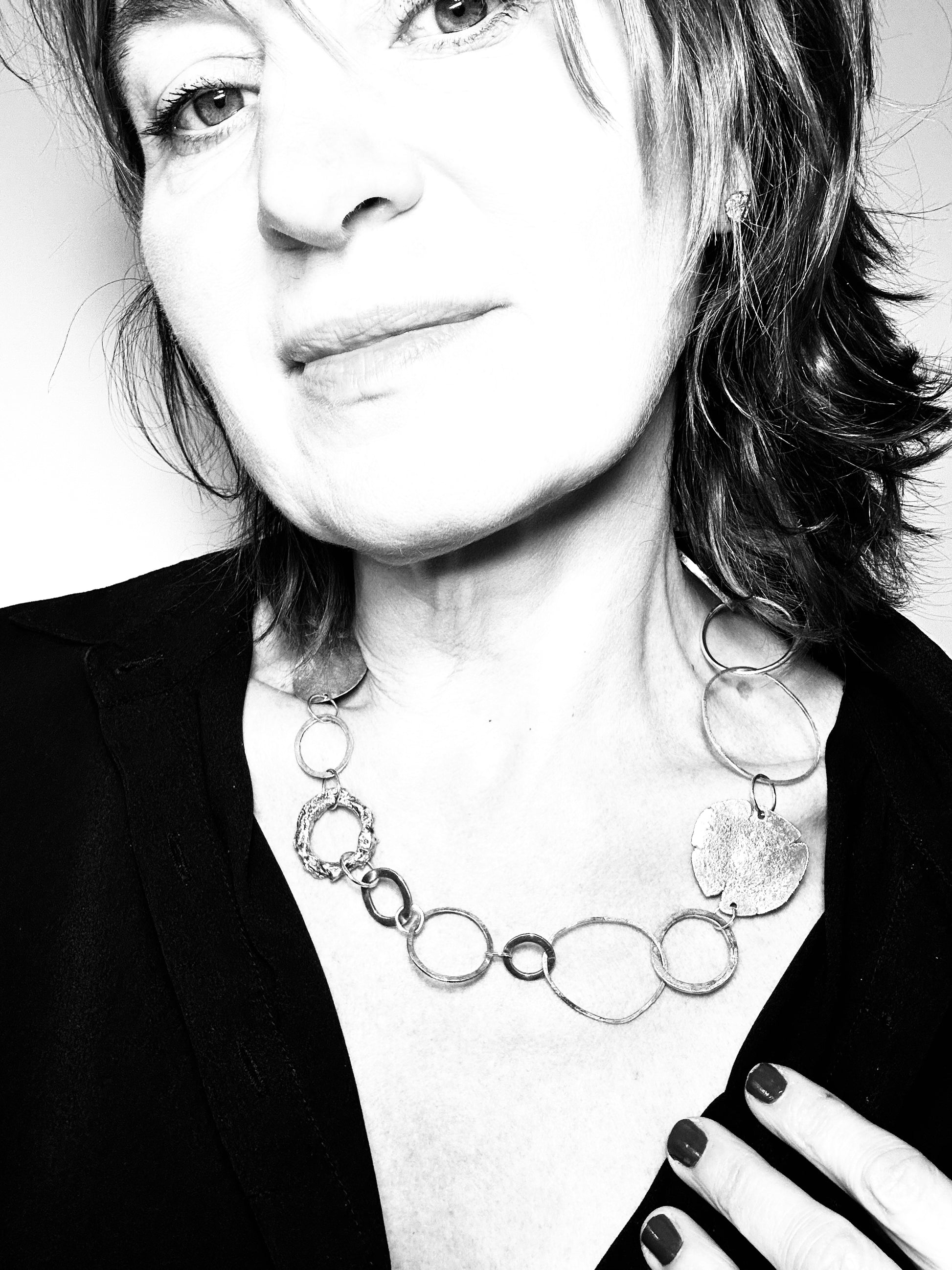 This sculptural necklace is composed of hand-formed and cast silver circles, each with a unique surface — from smooth to raw. A striking composition of contrast and movement.