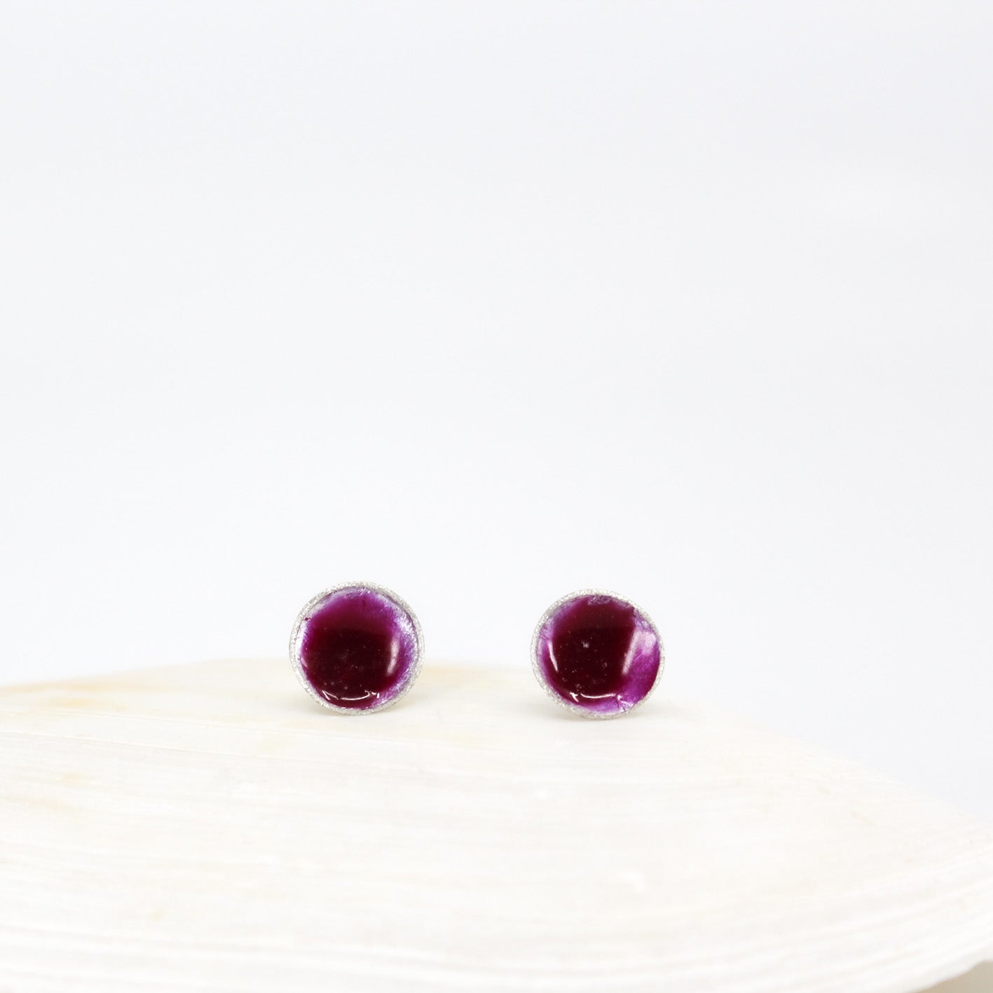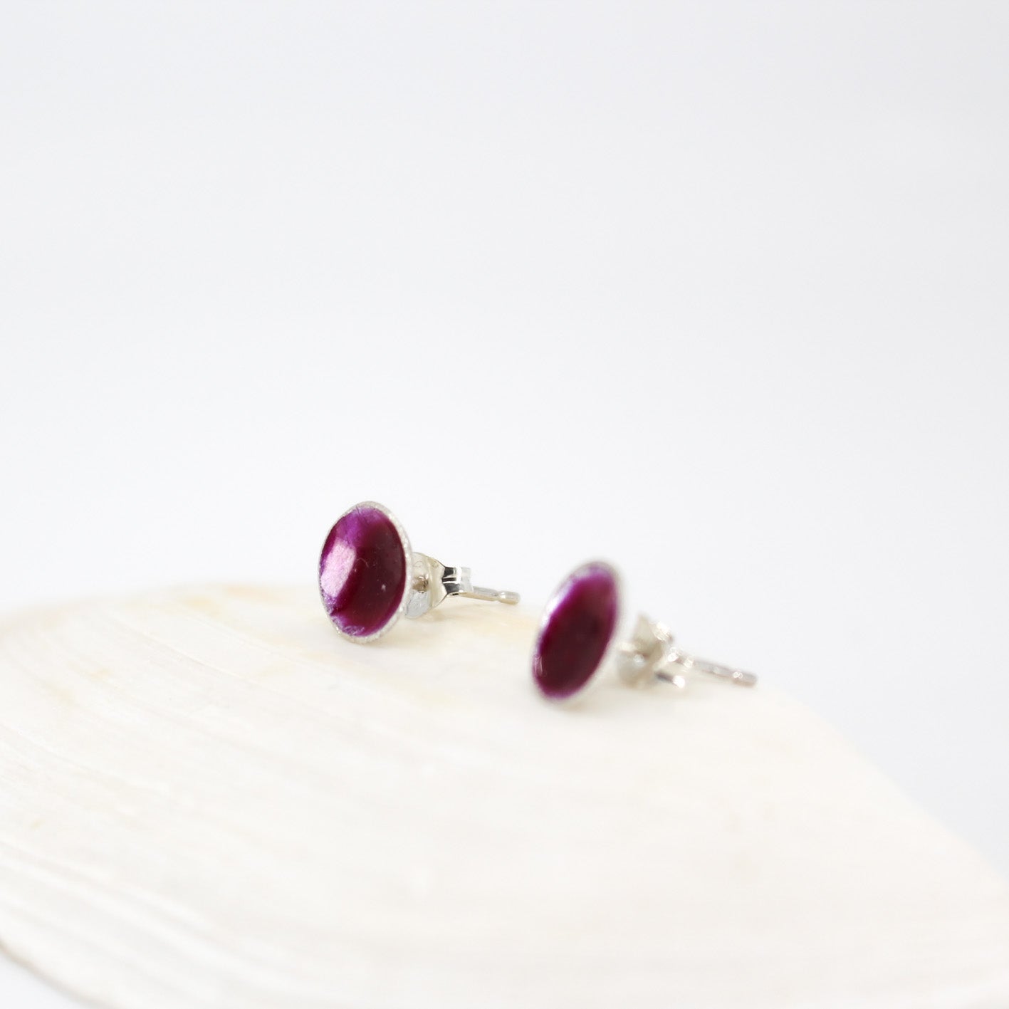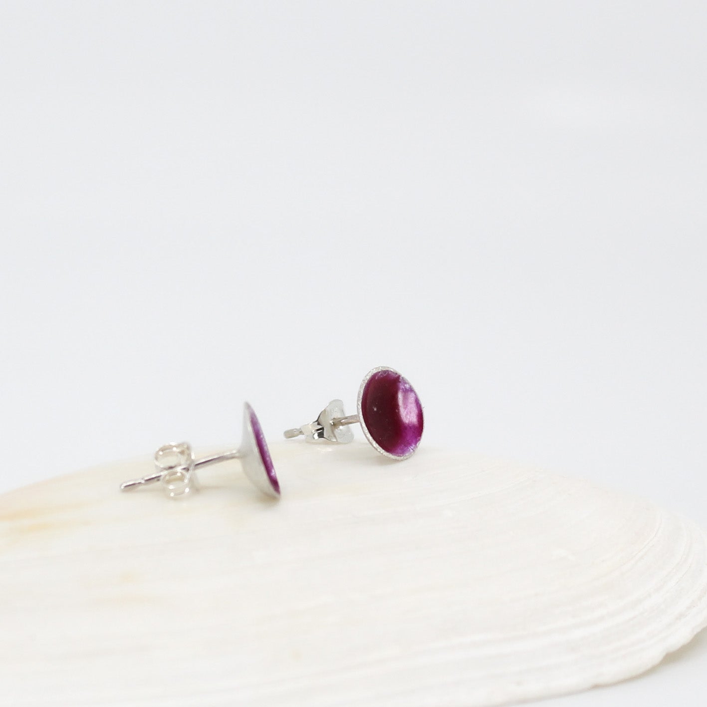 small round stud earrings in sterling silver filled with mauve purple resin