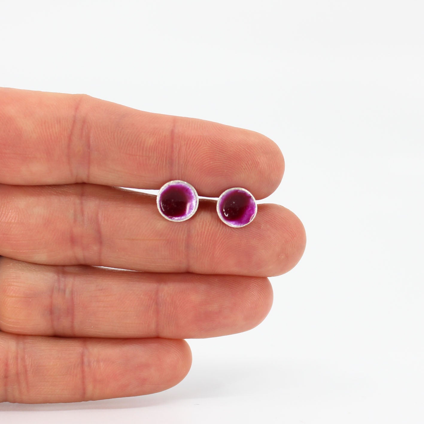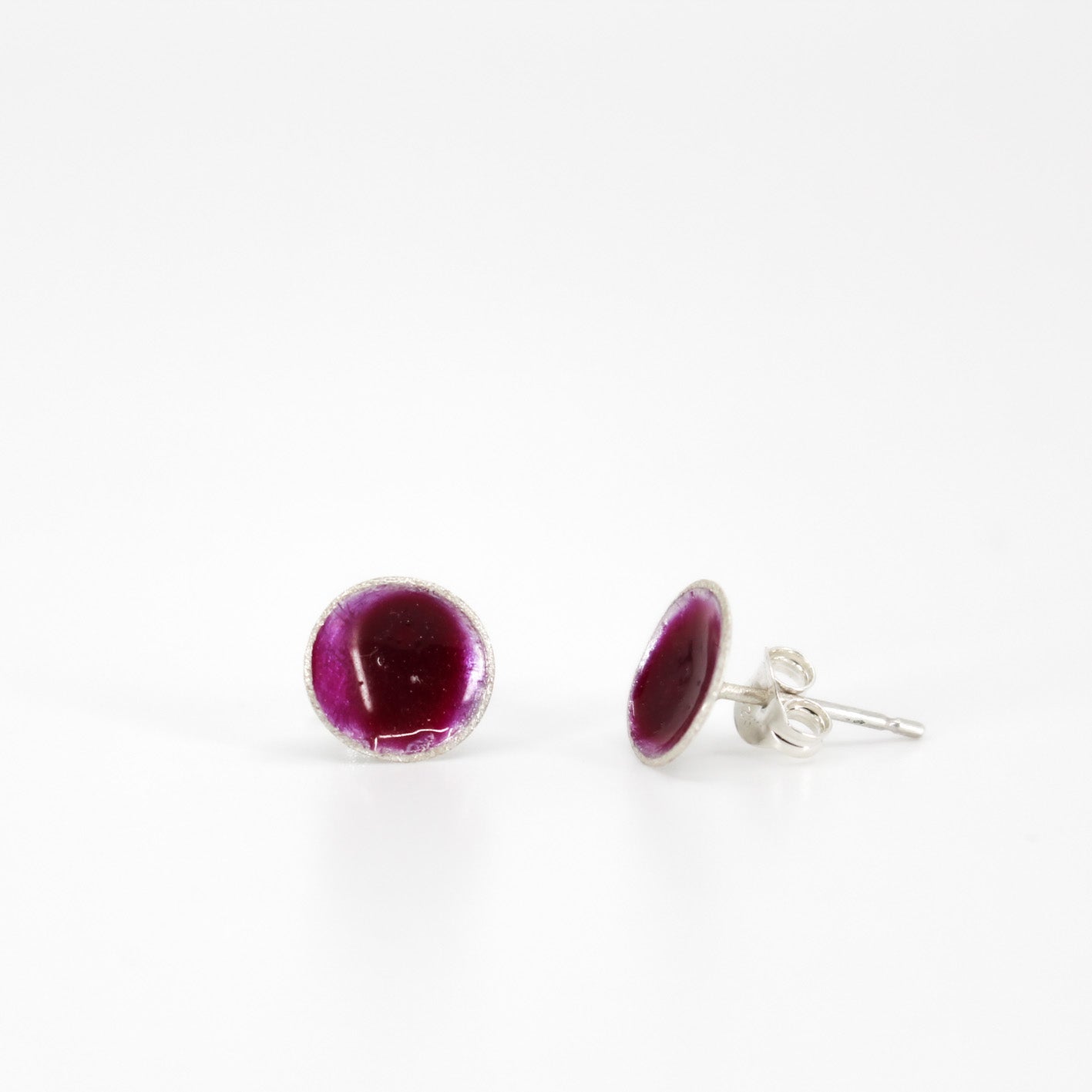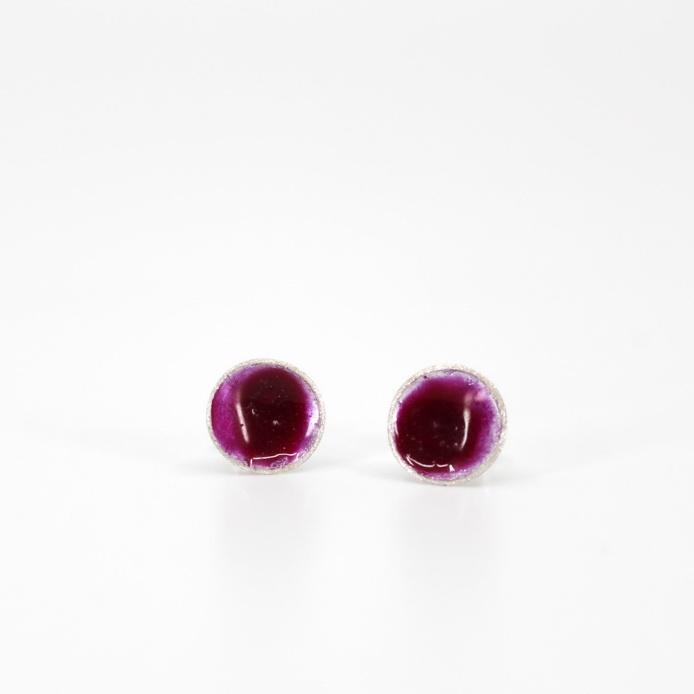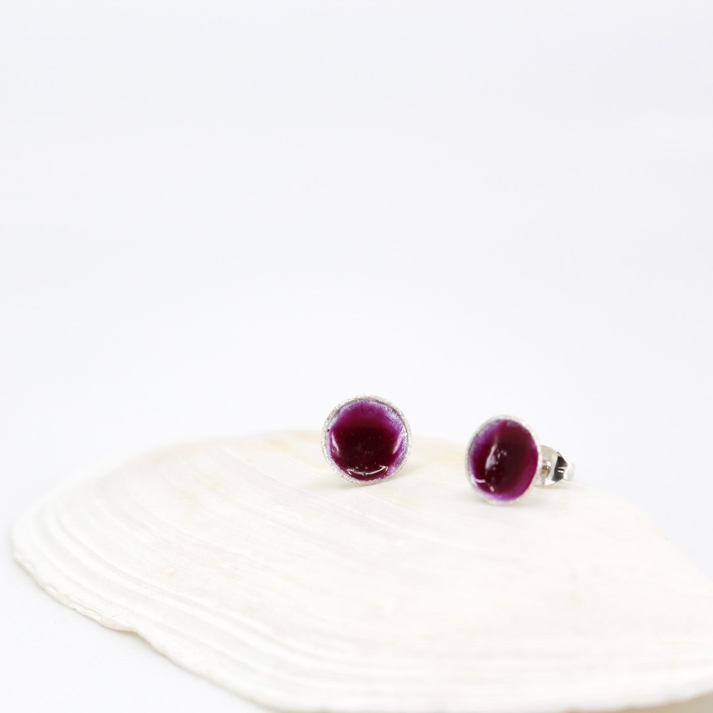 small round stud earrings in sterling silver filled with mauve purple resin