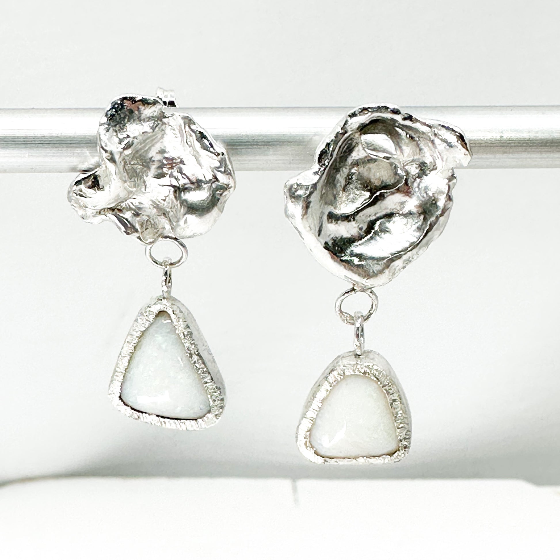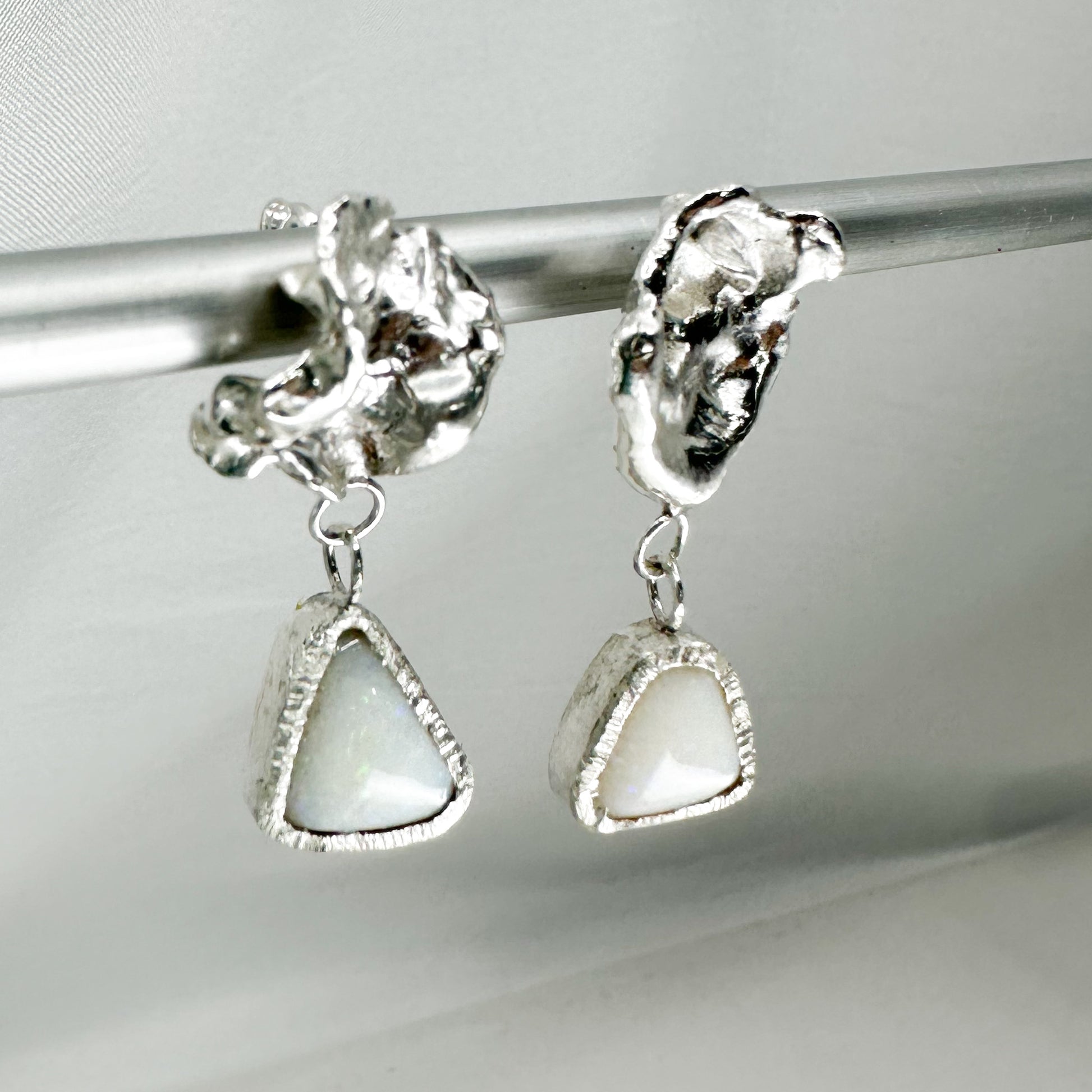 Each of these exquisite dangling silver earrings showcases a solid Australian white opal sourced during my recent trip to Australia.