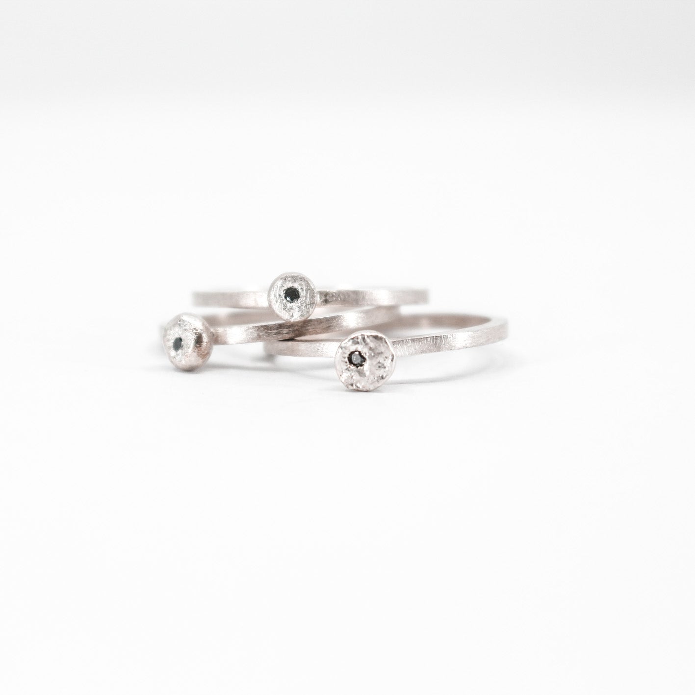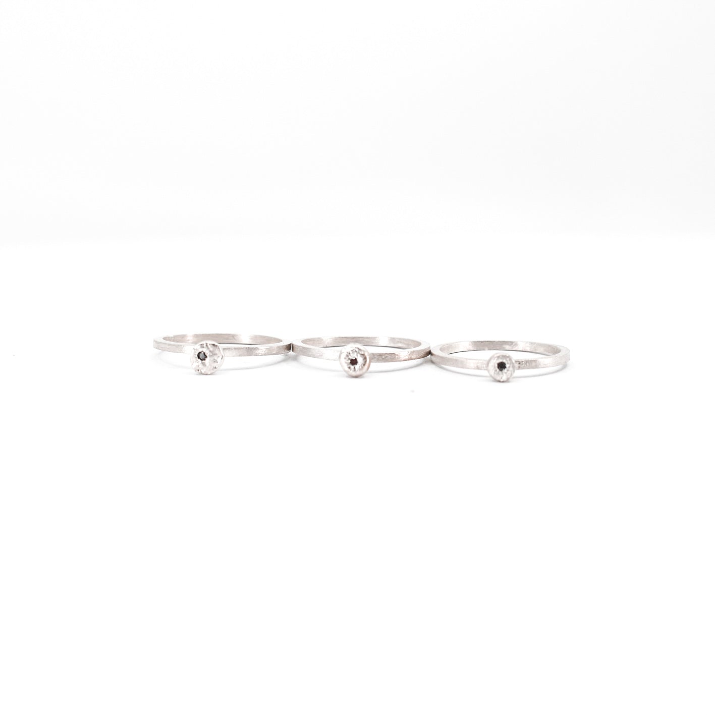 Elegant set of three simple stacking rings, each adorned with a beautiful black diamond.