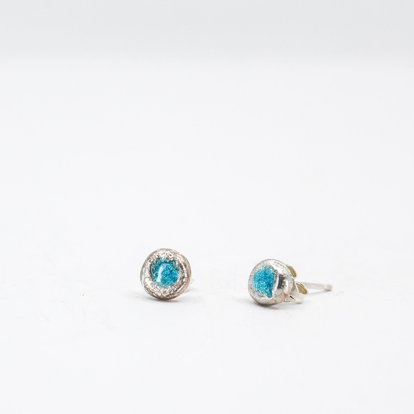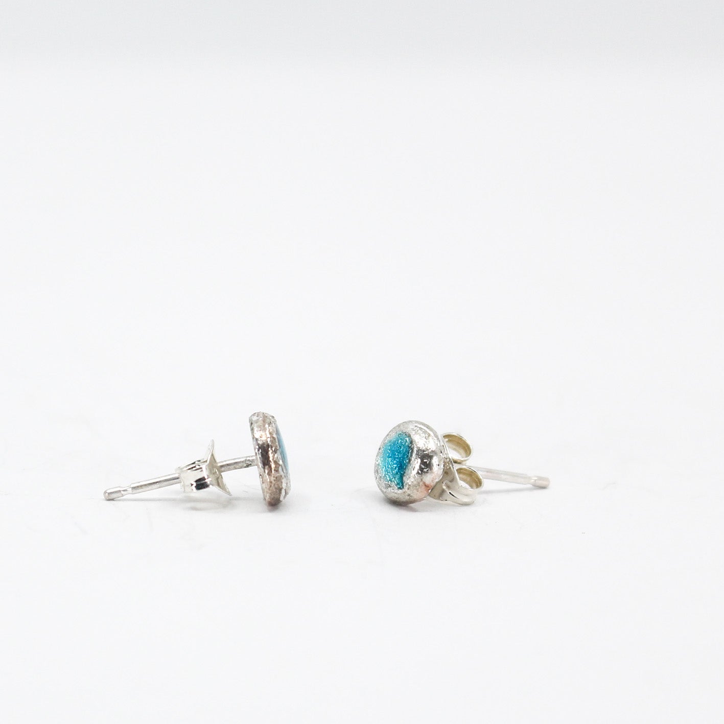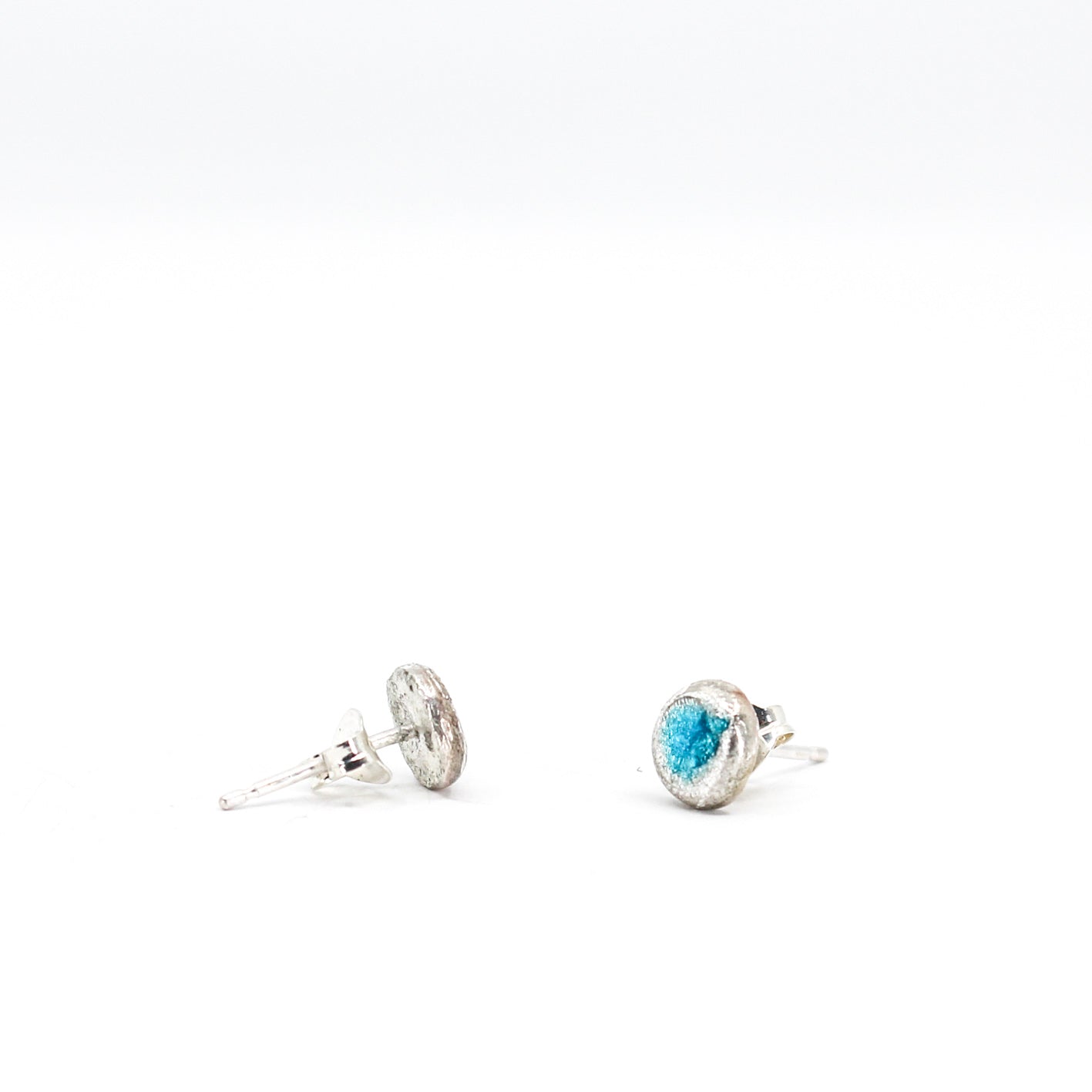 turquoise round small silver stud earrings • resin filled • handmade in France