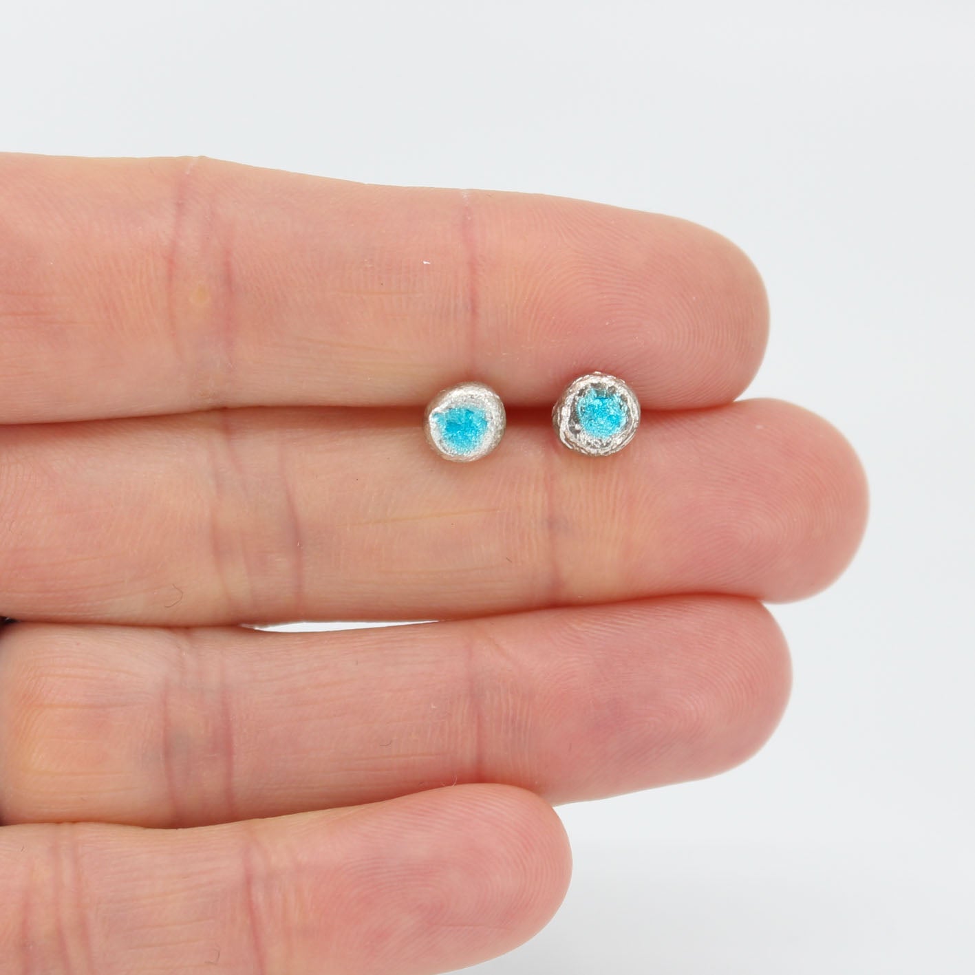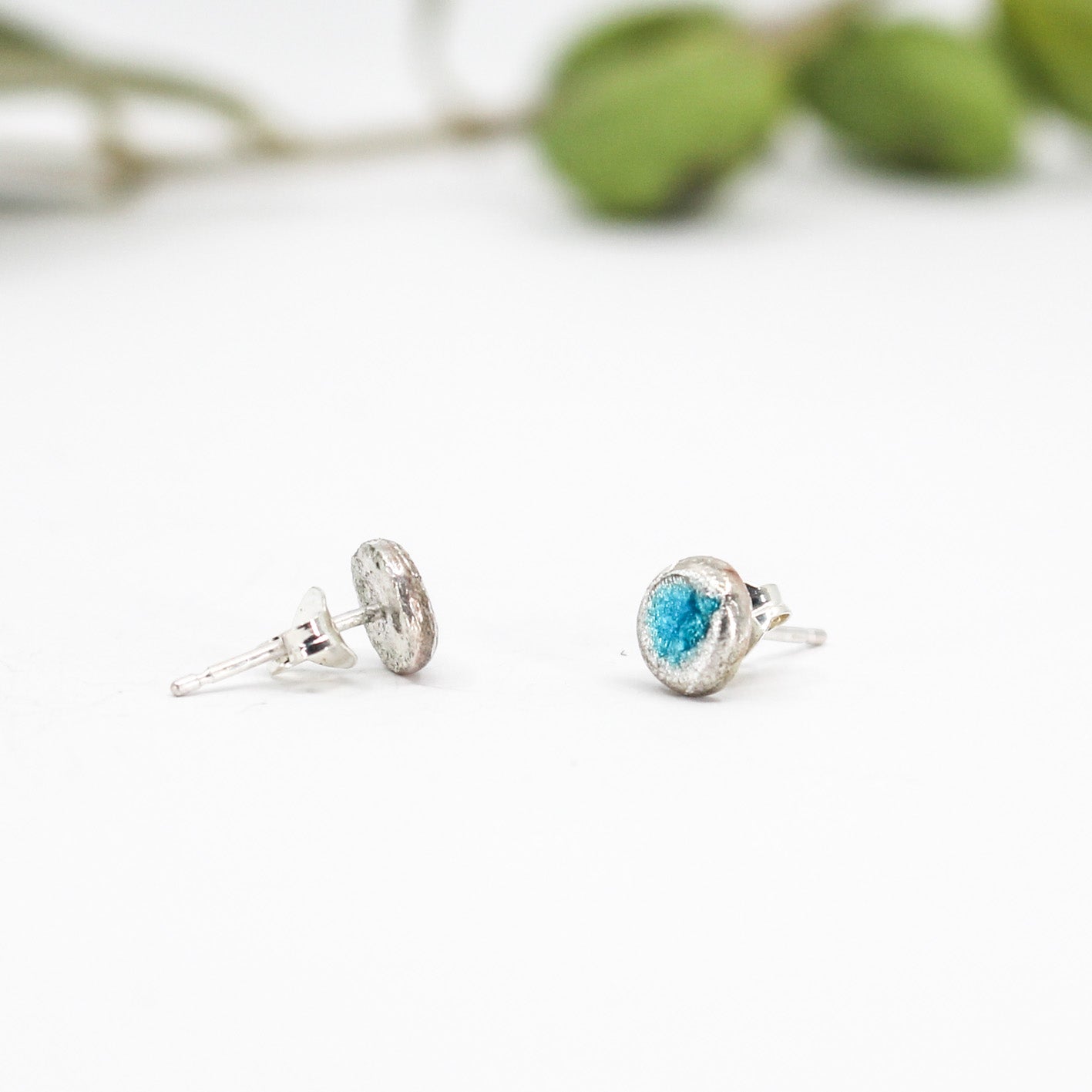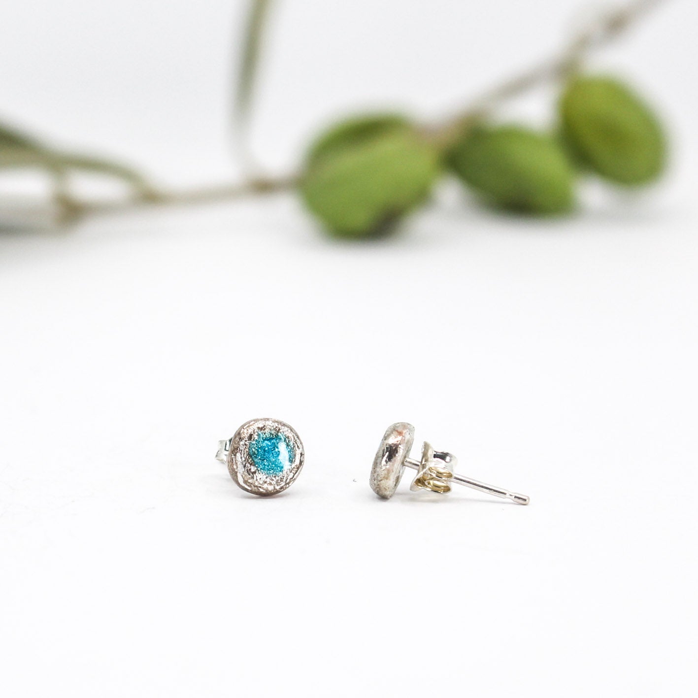 turquoise round small silver stud earrings • resin filled • handmade in France